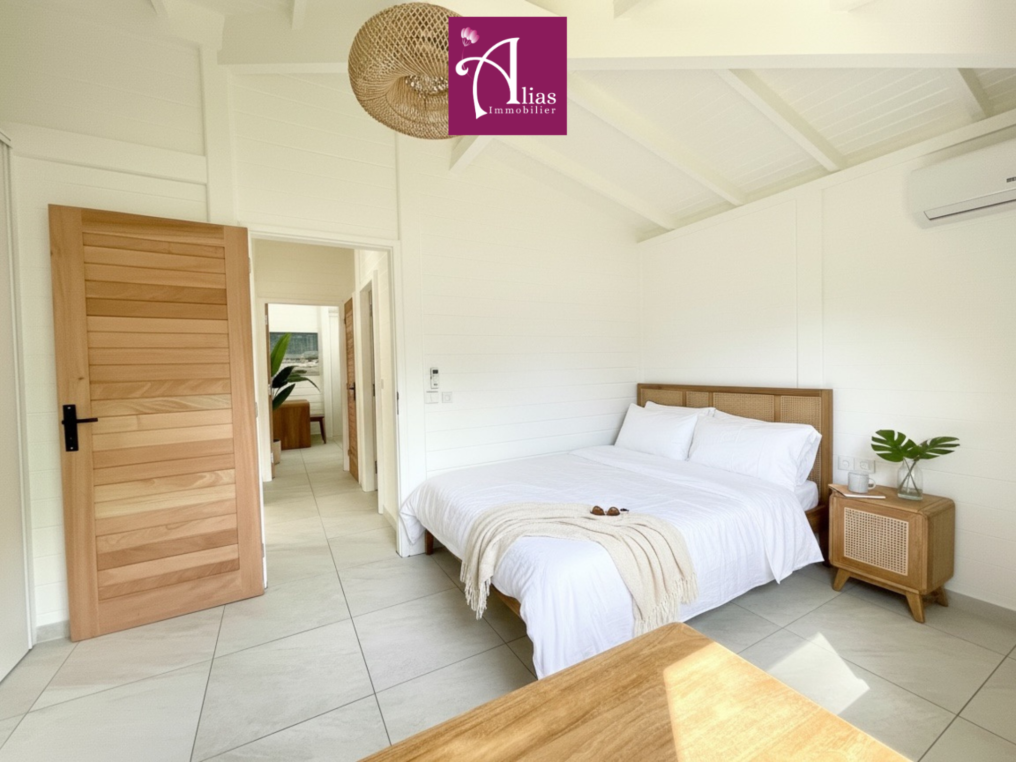 À l'intérieur, le séjour lumineux avec mezzanine séduit par ses volumes et son ambiance chaleureuse, sublimée par un mobilier en teck de qualité, vendu avec la maison. La cuisine américaine, aménagée et équipée, complète harmonieusement l'espace de vie.