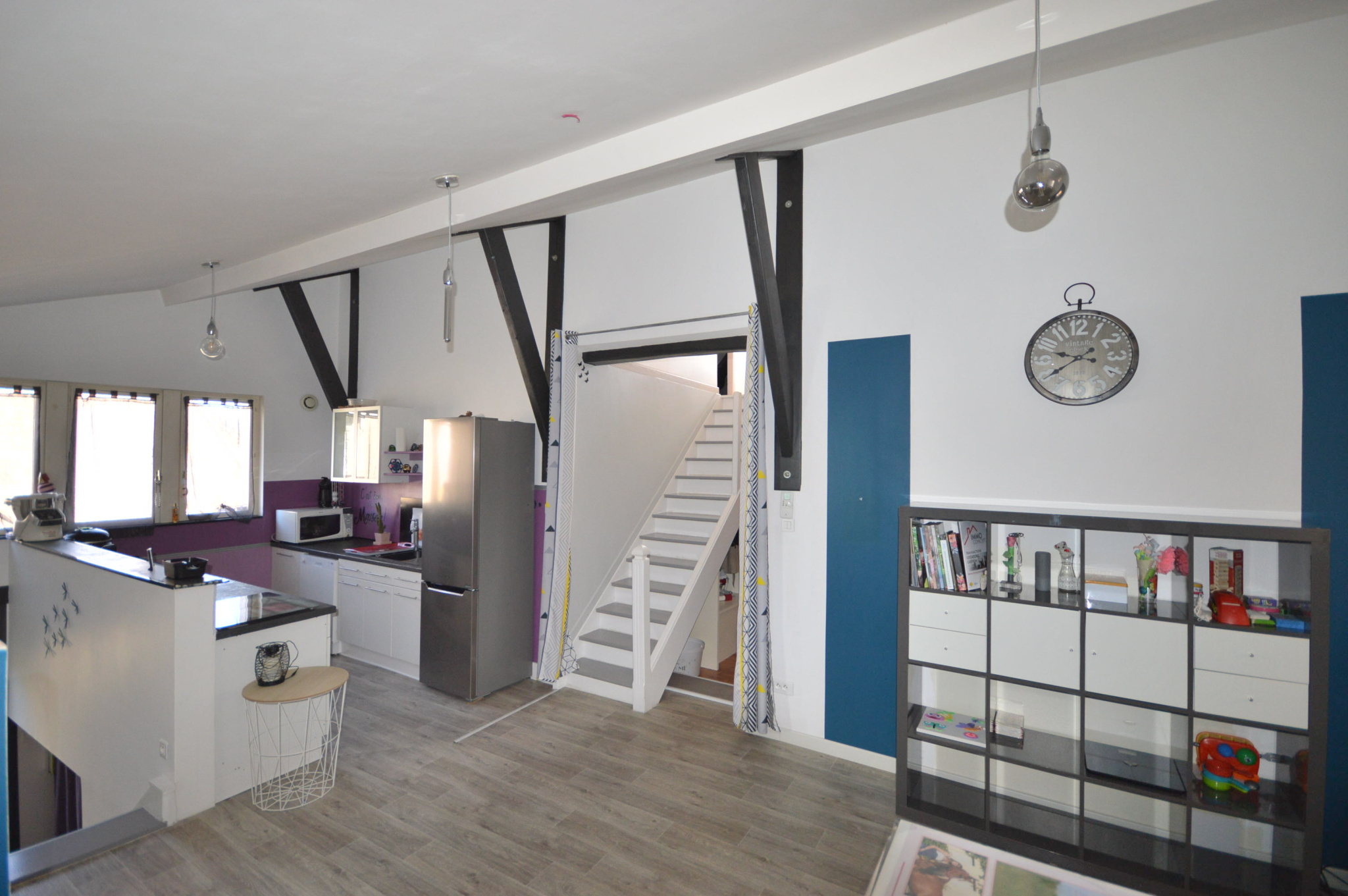 Elle comprends au 1er niveau :une cuisine équipée ouverte sur le séjour et le salon, un bureau, une salle de bain, un wc, une chambre. A l'étage, 2 chambres