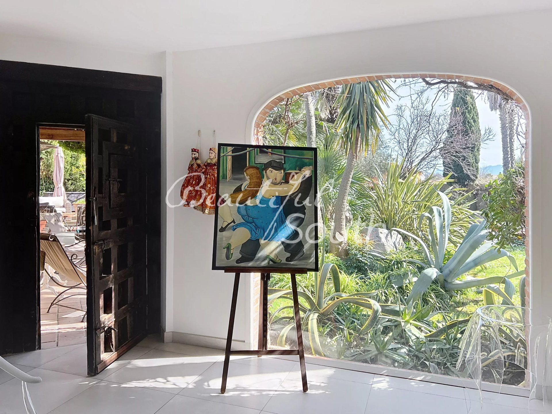 Le jardin, merveilleusement arboré, invite à la détente : terrasses ensoleillées, cuisine d’été et piscine à débordement promettent des instants privilégiés sous le ciel méditerranéen.