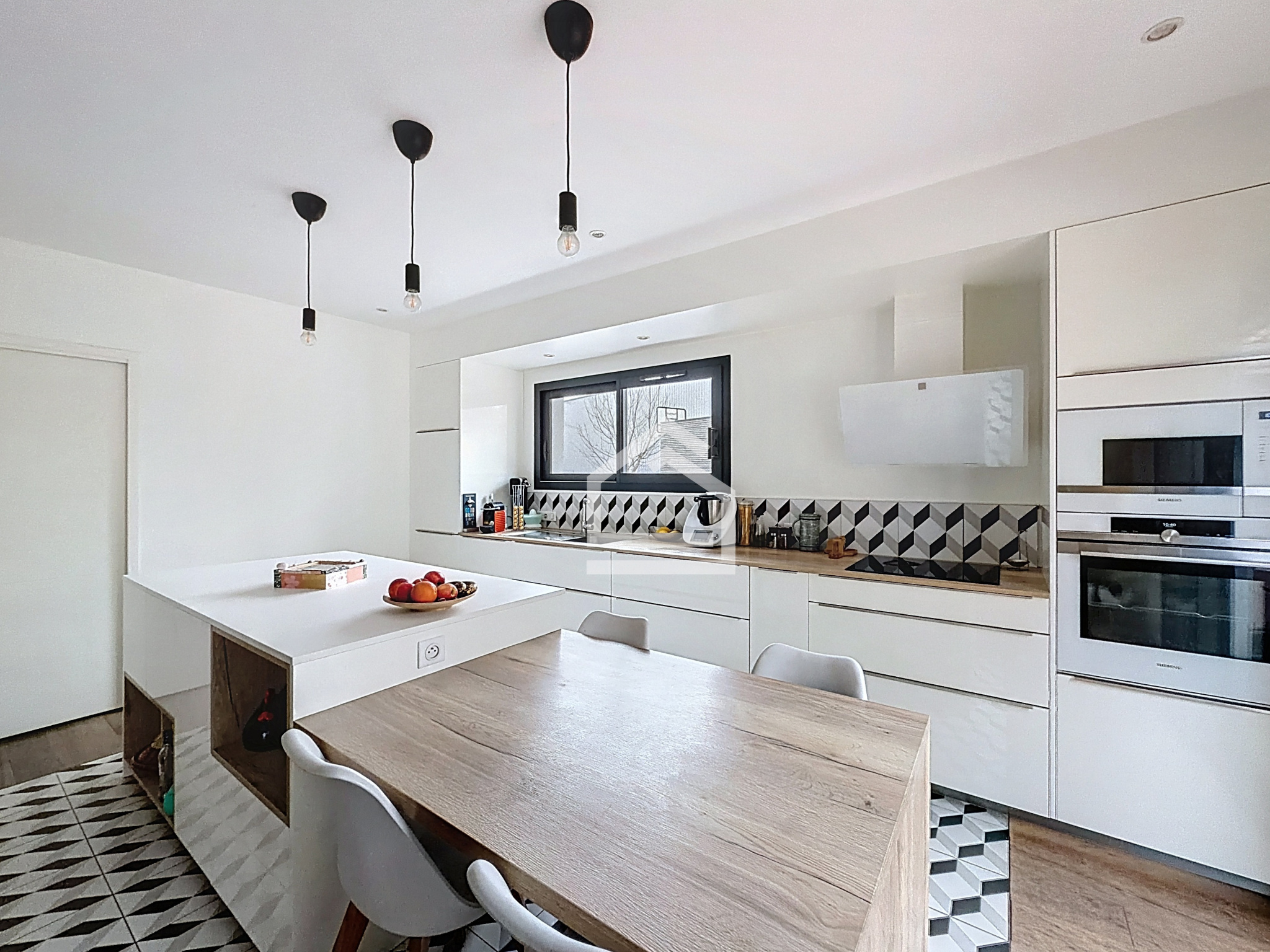 La cuisine semi-ouverte, fonctionnelle et contemporaine, s'intègre avec fluidité à l'ensemble et se prolonge par une buanderie attenante. Deux WC indépendants complètent l'ensemble pour un confort optimal au quotidien.