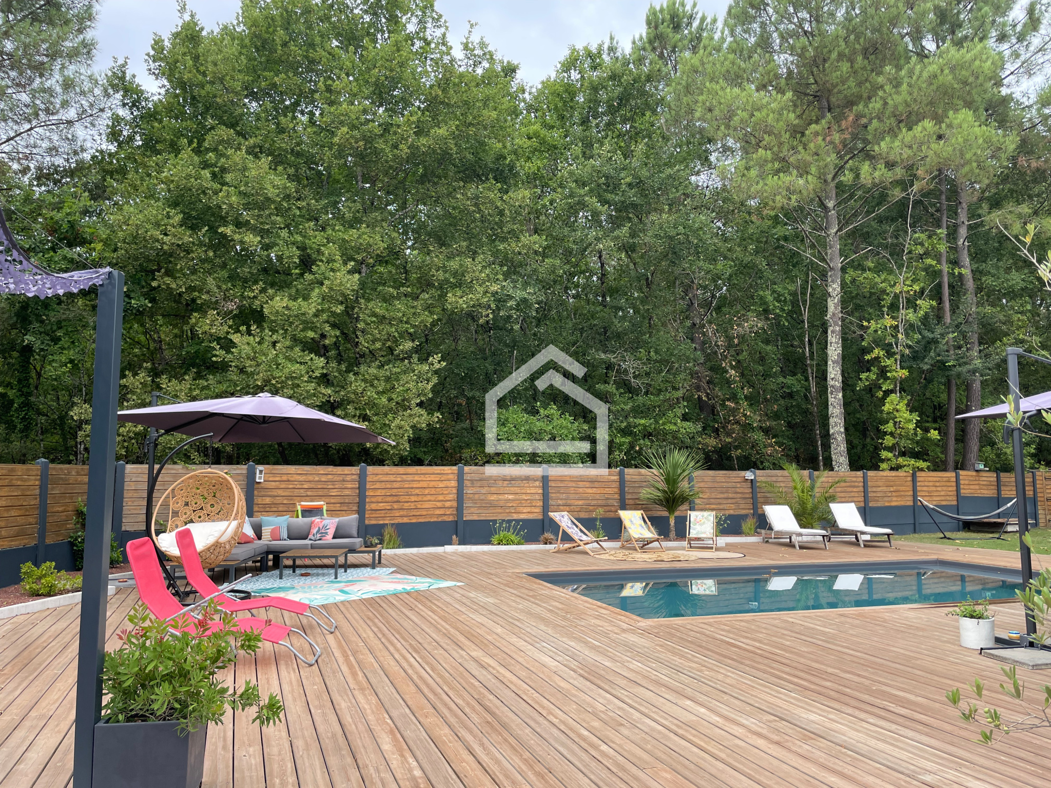 La piscine et la vaste terrasse constituent un véritable lieu de vie supplémentaire dès les beaux jours, propice à la détente et aux réceptions estivales.