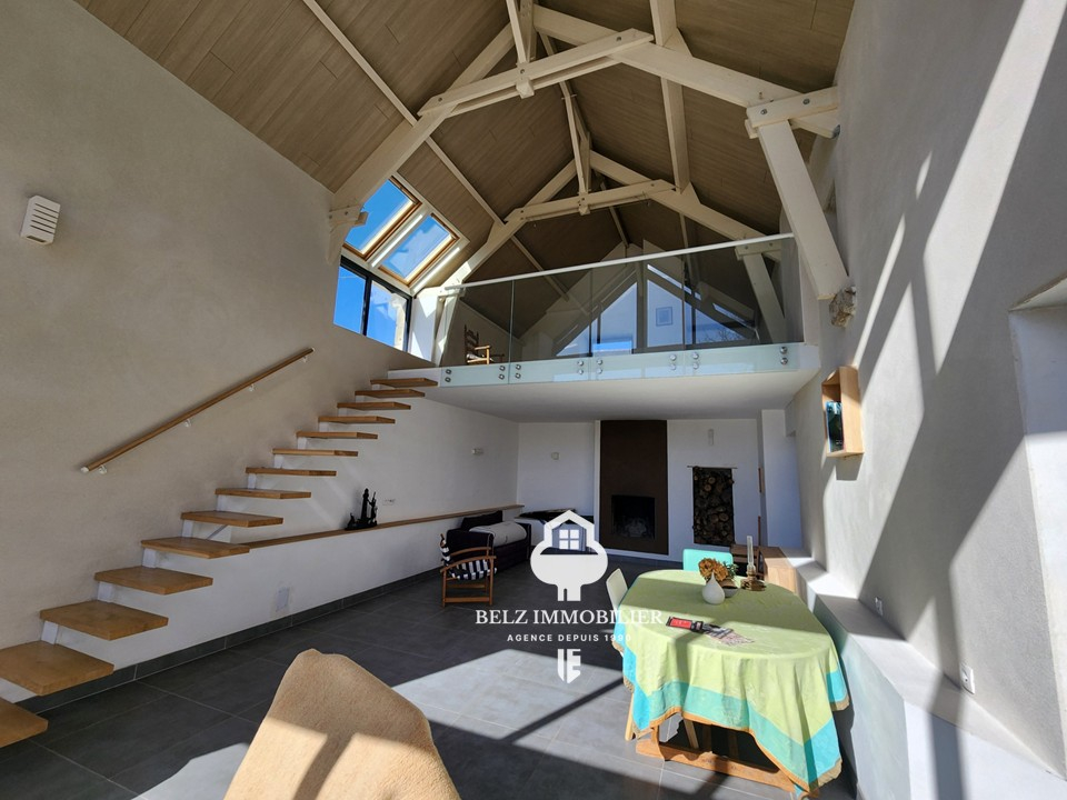 Elle se compose d'une belle entrée, une cuisine aménagée et équipée, une spacieuse pièce de vie avec cheminée, deux chambres, dont une en rez-de-chaussée avec dressing, salle de bains, deux wc. Elle offre un véritable confort de vie au quotidien. Deux mezzanines viennent compléter l'ensemble, apportant des espaces supplémentaires modulables selon vos envies : bureau, coin lecture ou chambres.