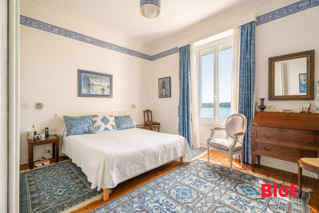 Dès l'entrée, le charme opère : la pièce de vie baignée de lumière, exposée Est-Ouest, dévoile une vue spectaculaire sur la mer grâce à son large bow-window, véritable tableau vivant au fil des marées.