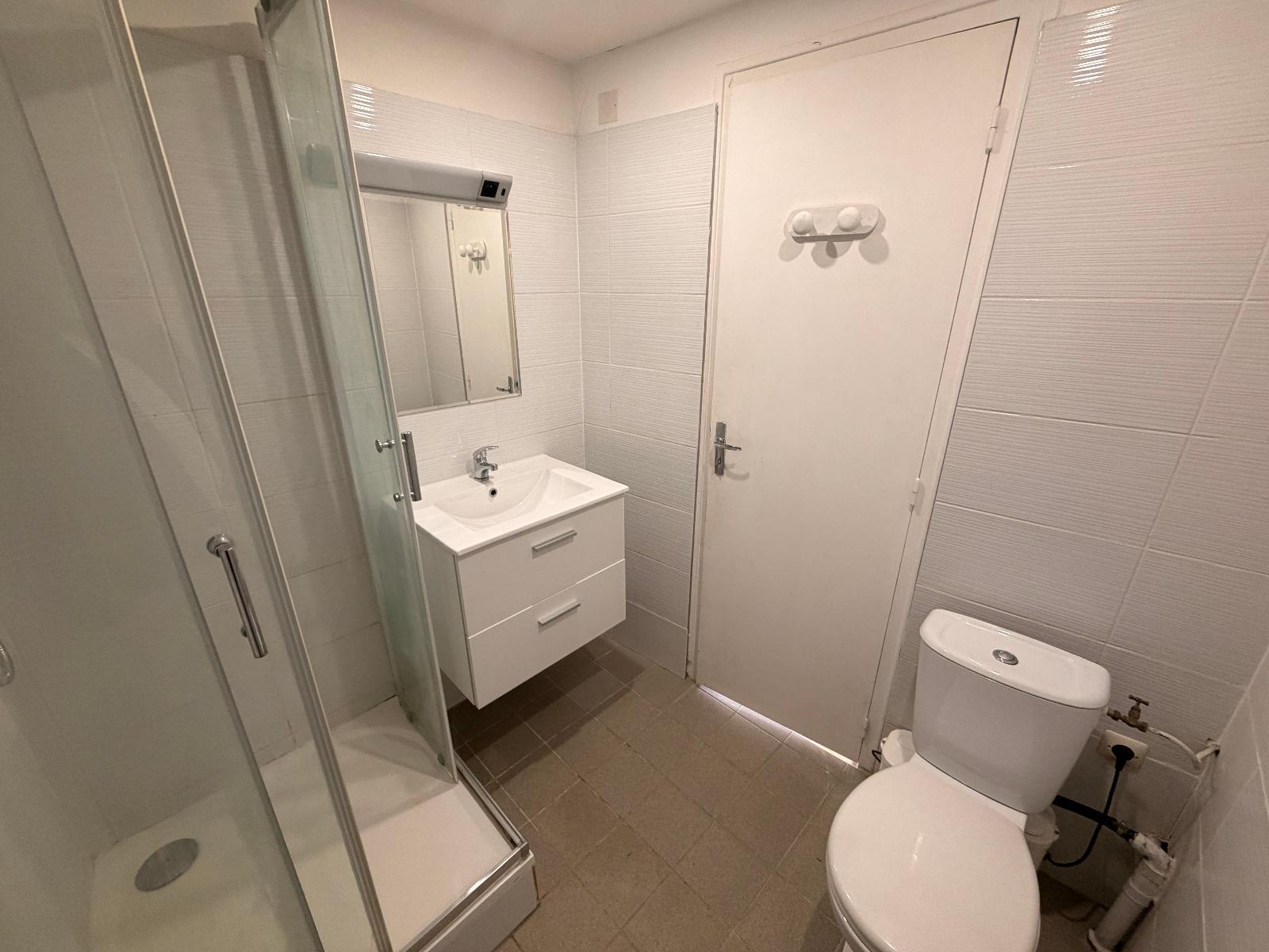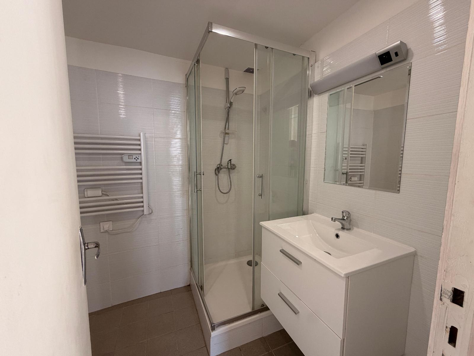 La pièce principale, spacieuse et de forme rectangulaire, permet un aménagement facile. La cuisine équipée est séparée par un meuble bar, créant un espace convivial et fonctionnel. La salle de douche a été entièrement rénovée en 2024, offrant un espace moderne et agréable.