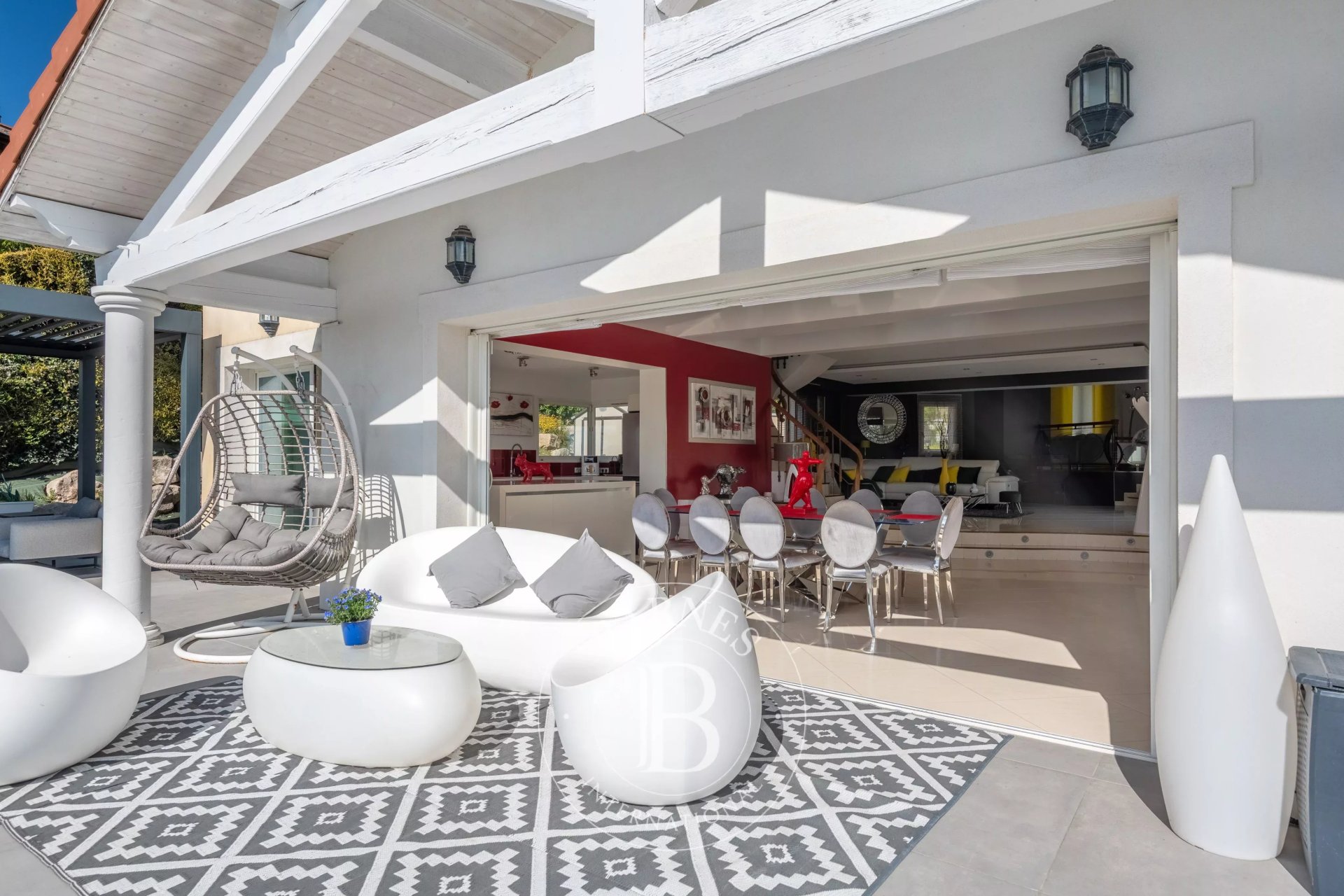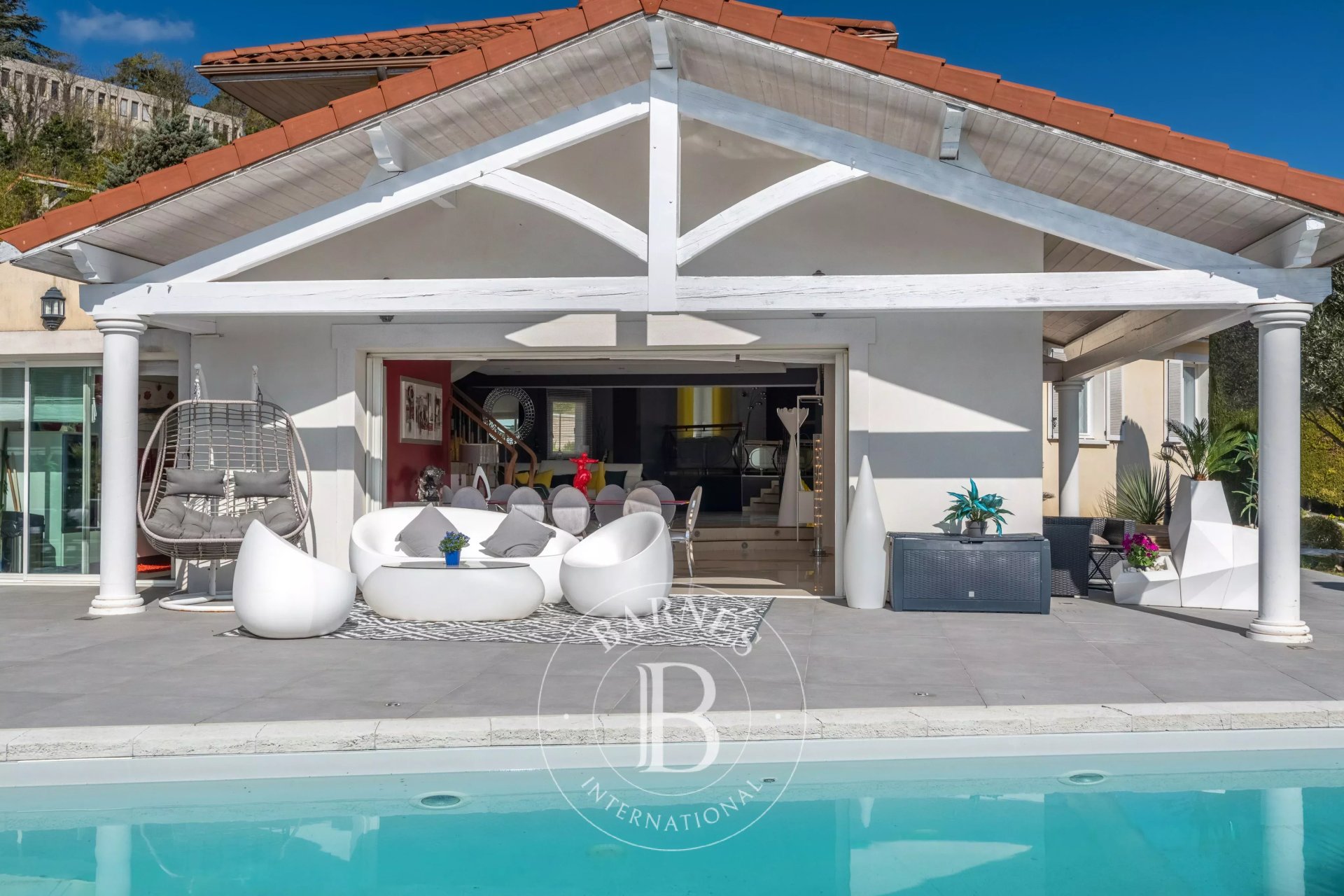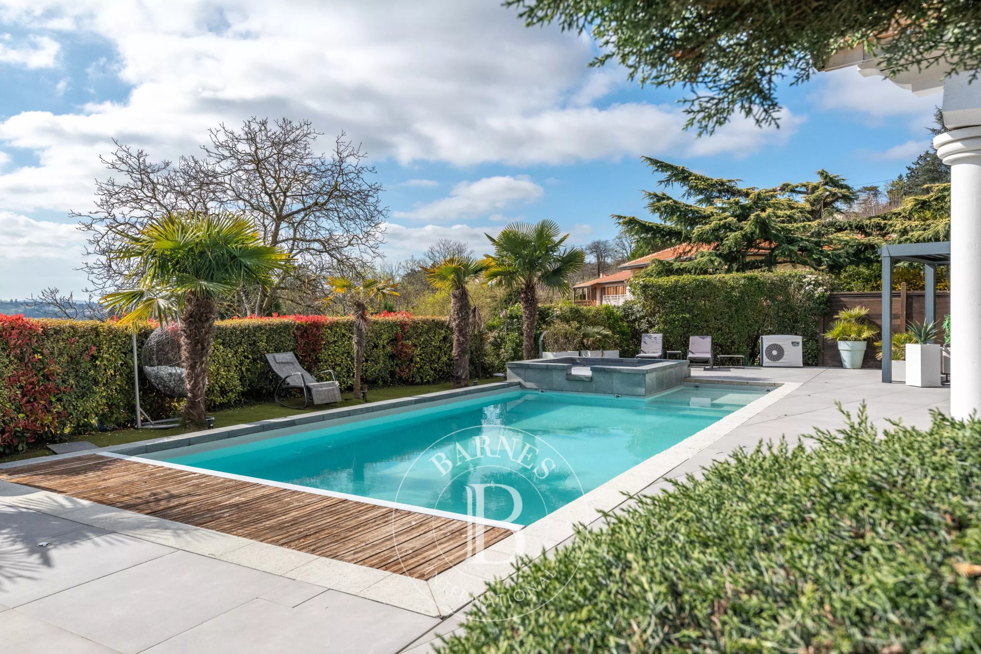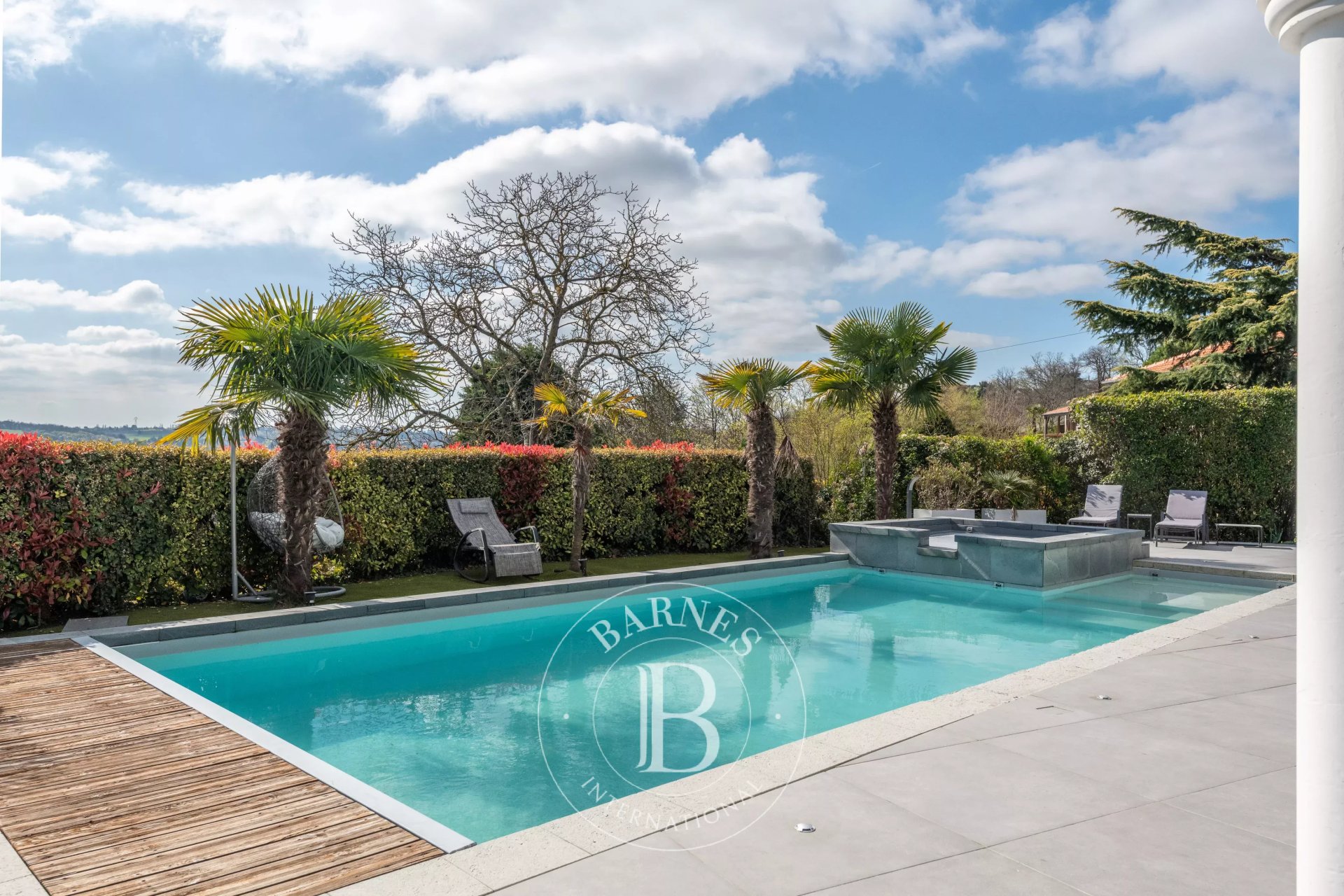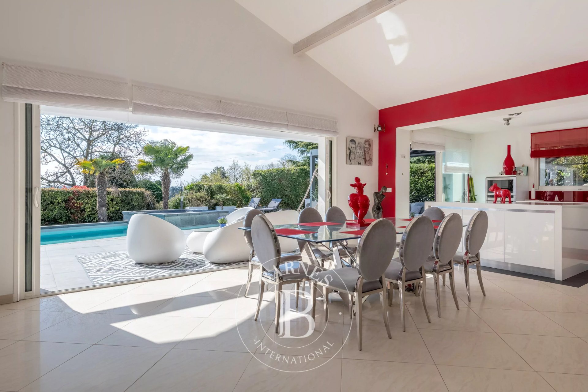 Nichée dans un environnement résidentiel prisé, cette élégante propriété développe environ 230 m² habitables et bénéficie d’un magnifique jardin arboré de 1 500 m² agrémenté d’un espace piscine.