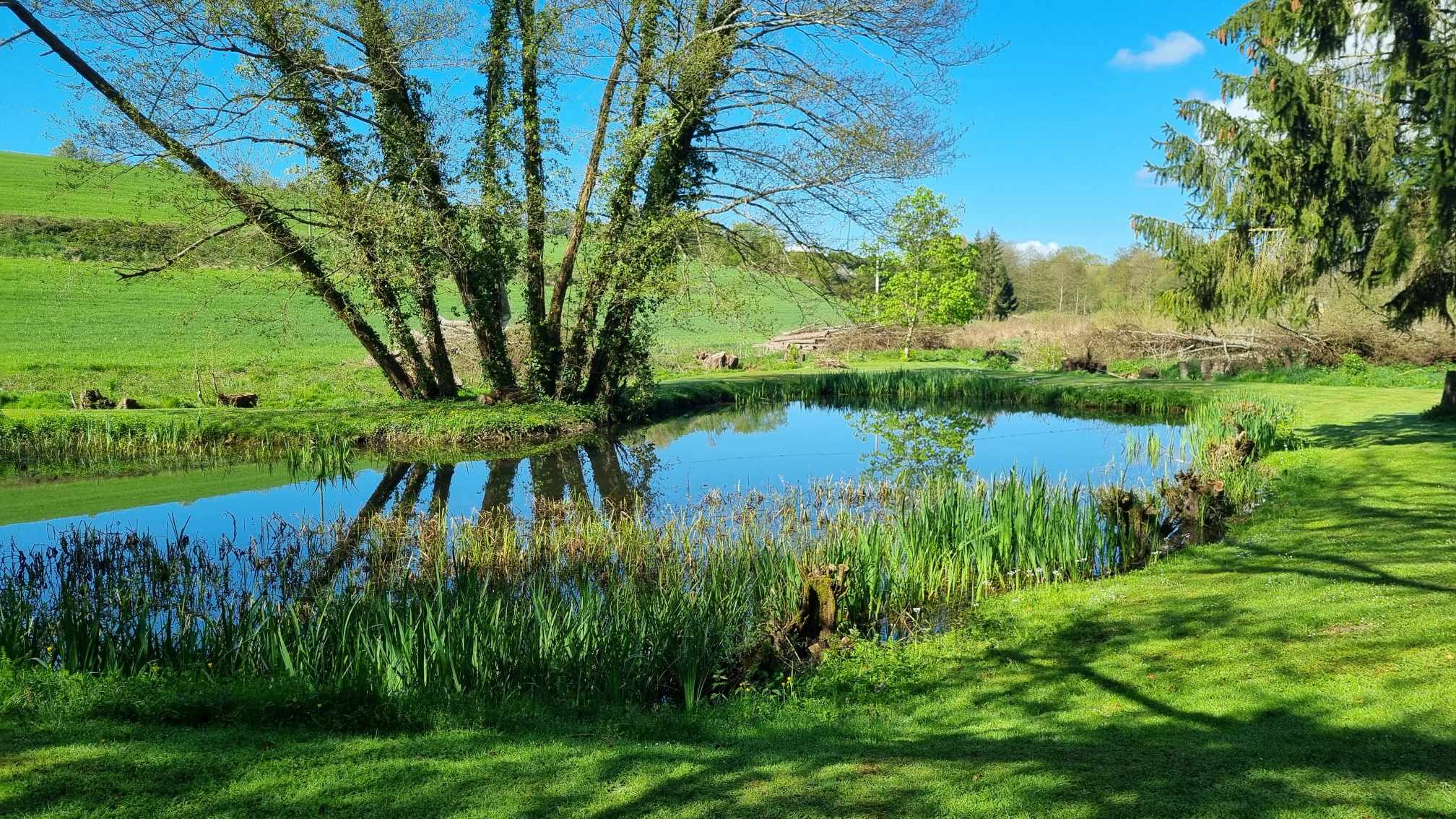Terrain de loisirs arboré avec une belle pièce d'eau alimentée par des sources.