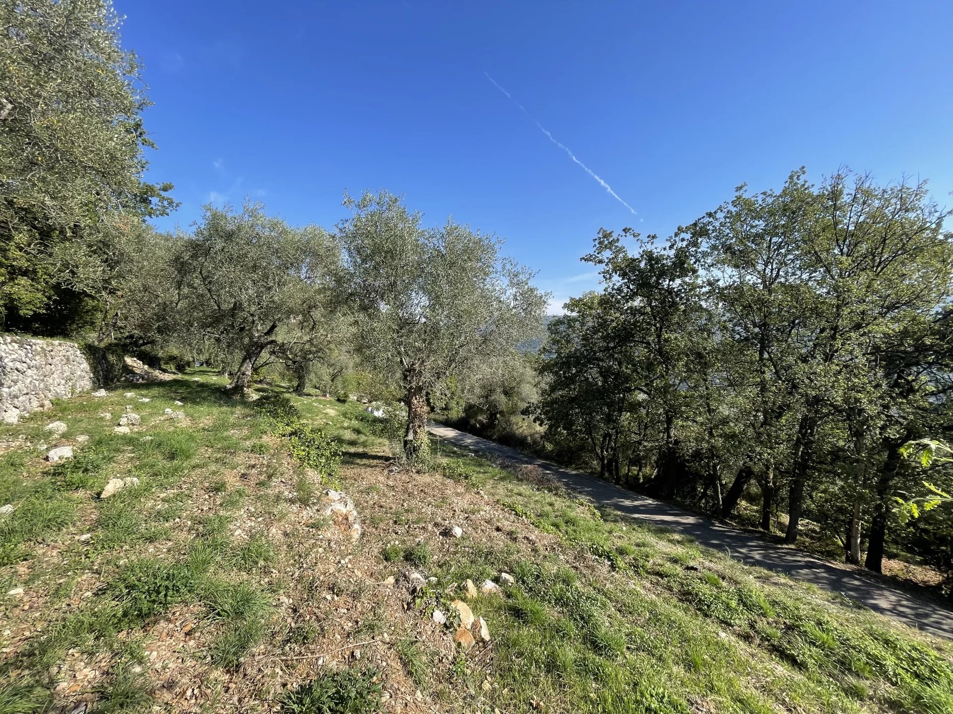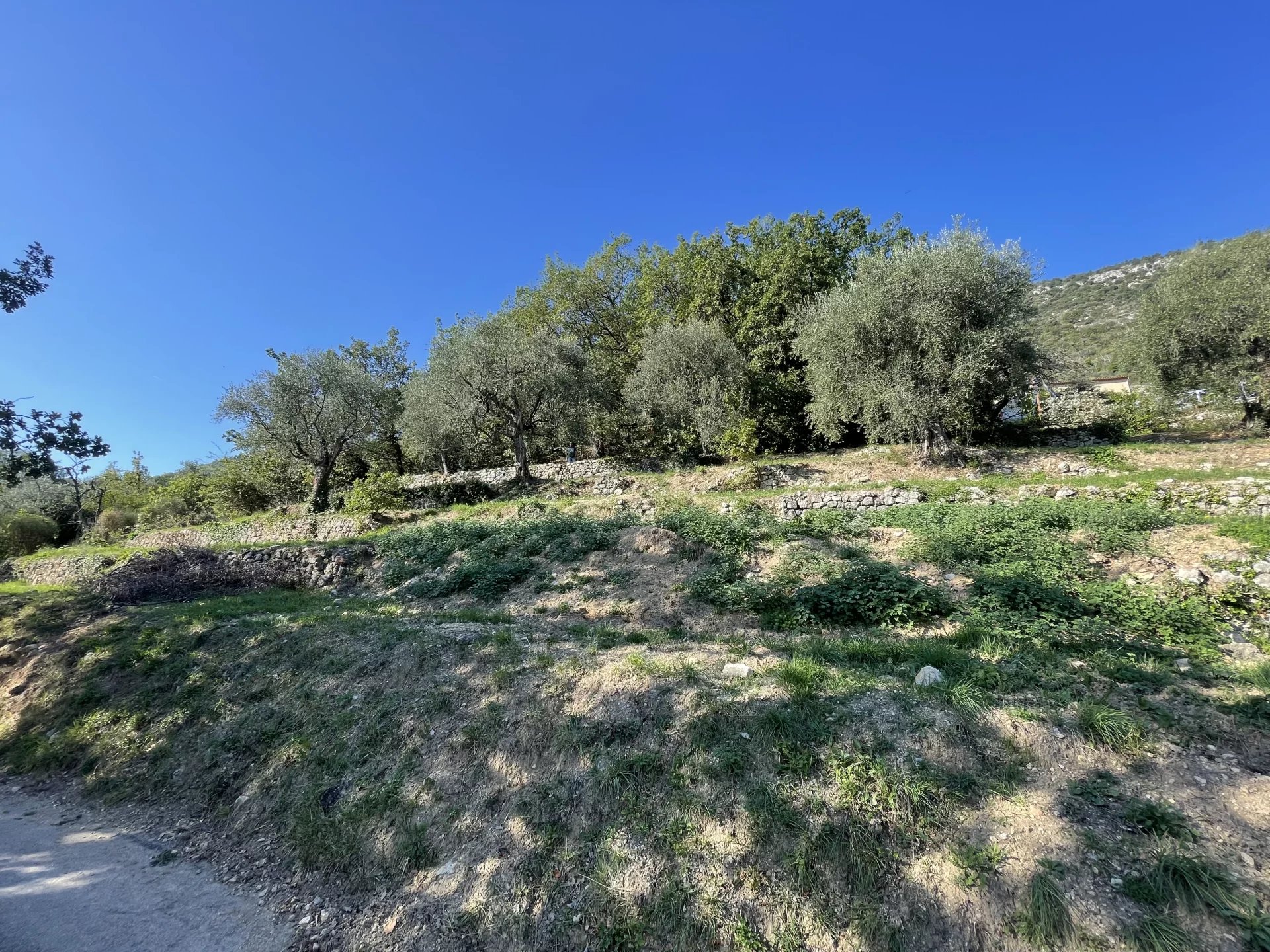 Terrain constructible à proximité du village et de l'école, beau terrain complanté d'oliviers, au calme absolu, en restanque et en position dominante de 1950m2 en exposition sud est avec vue panoramique sur les vallées.