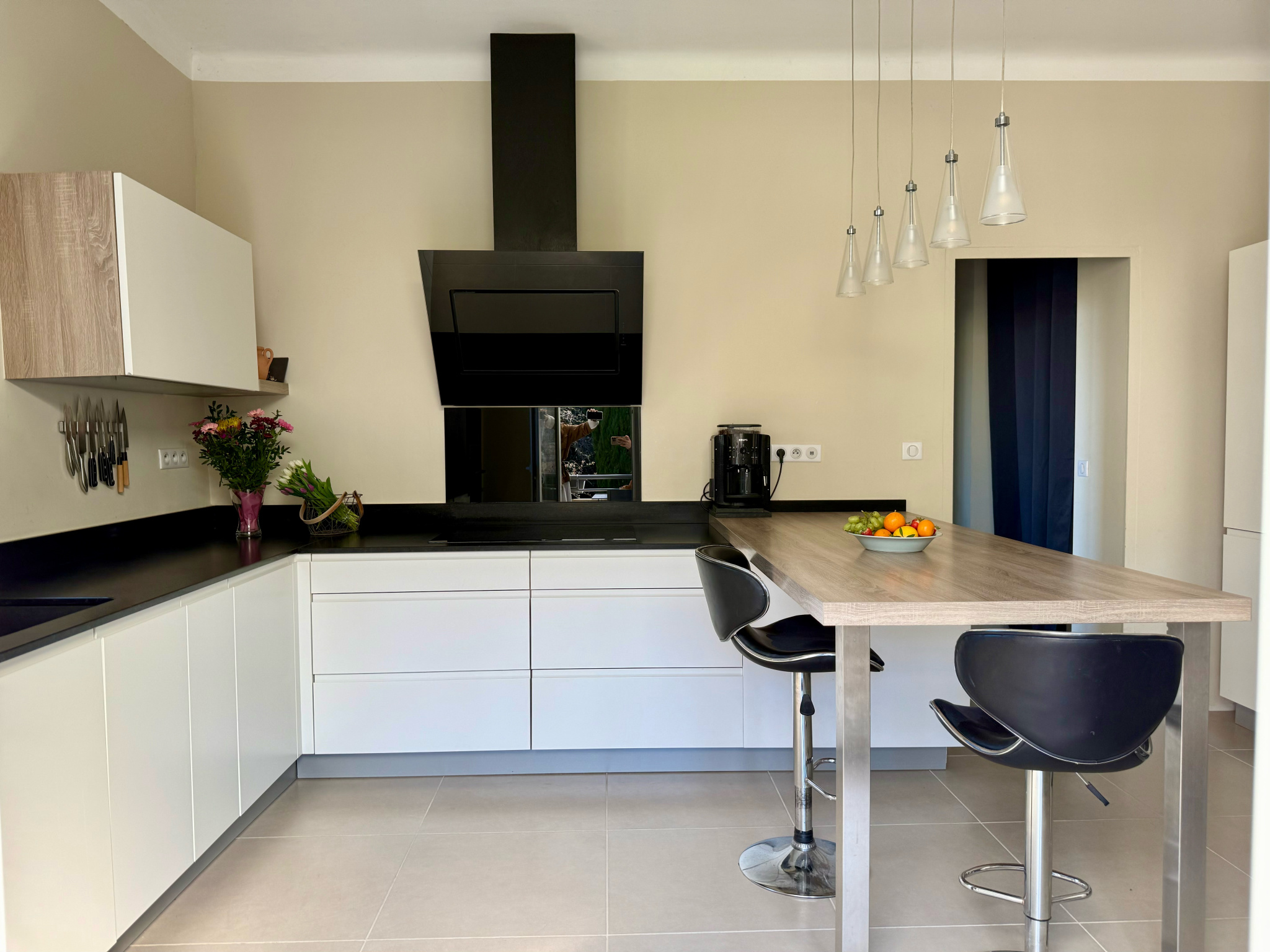 Une cuisine aménagée et équipée bénéficie d'une belle luminosité, ouverte sur une terrasse d'environ 10m2 exposition Sud, idéale pour les repas en extérieur.