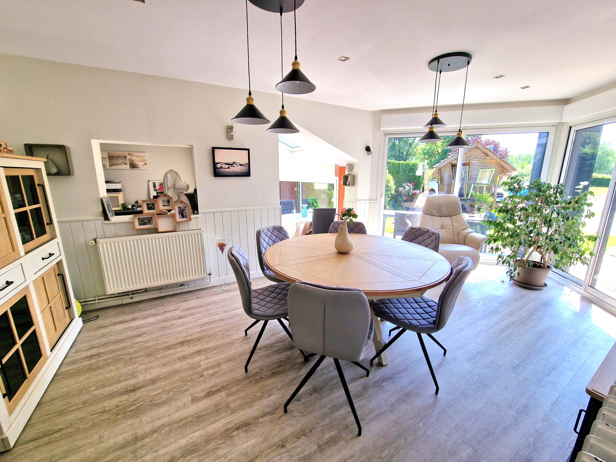 A la suite une salle à manger côté jardin, avec doubles baies vitrées qui s'ouvrent harmonieusement sur le jardin, invitant la lumière naturelle à baigner l'espace intérieur.