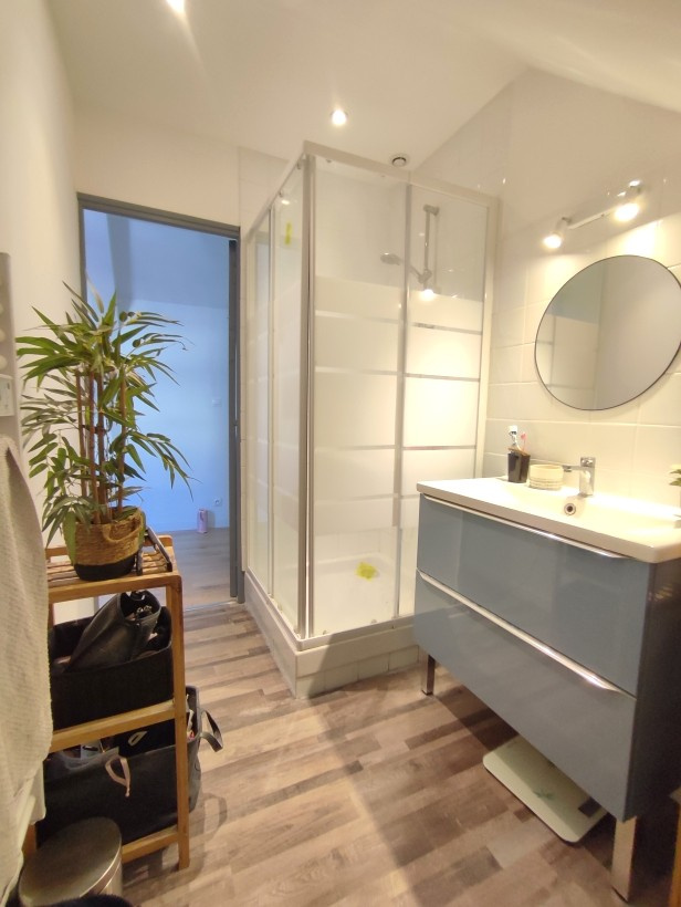 Elle se compose d'un salon lumineux, une cuisine aménagée, au 1er étage, un palier, deux chambres, une salle de bains et au 2ème étage, une grande chambre avec salle d'eau.