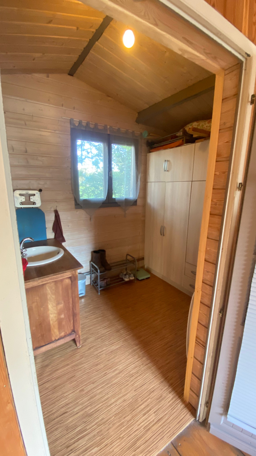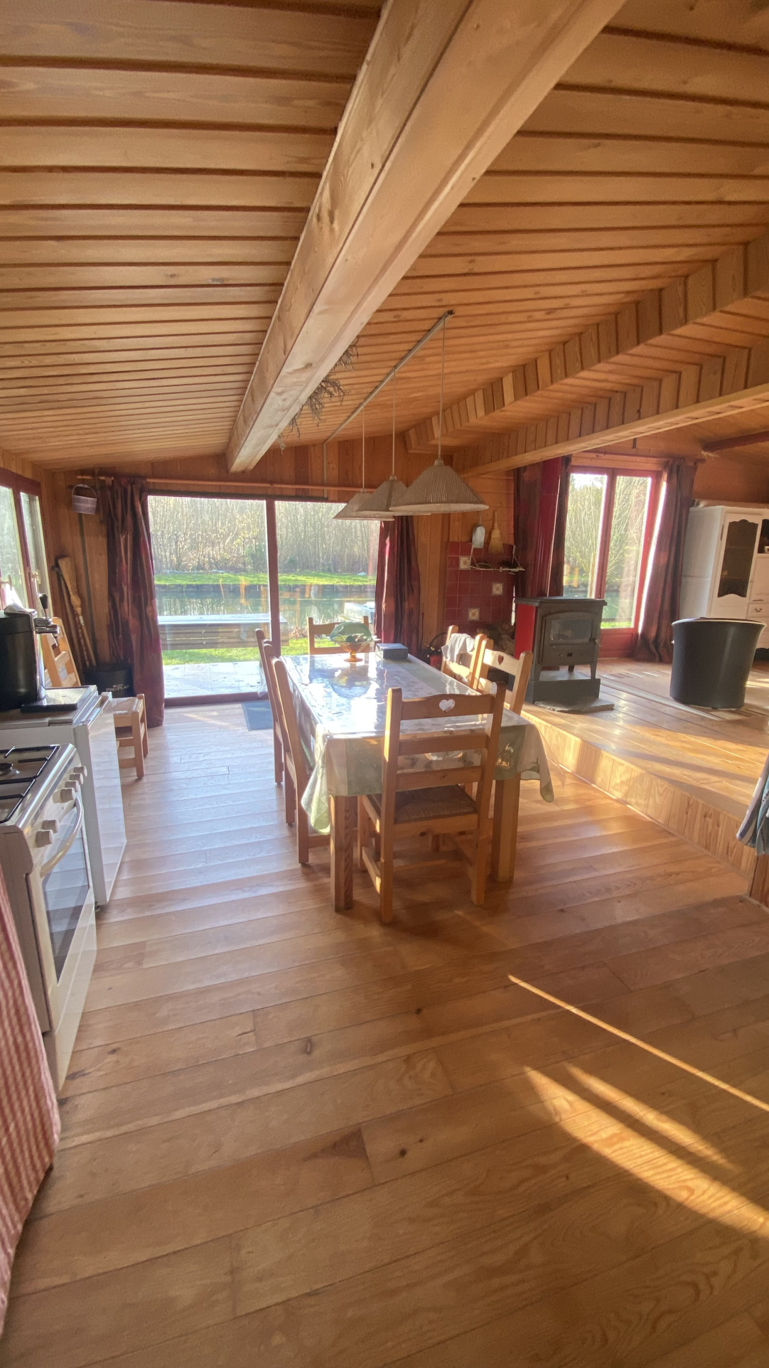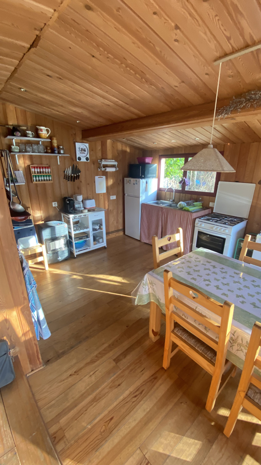 Le chalet de 74 m2 propose une pièce de vie, une cuisine équipée ainsi qu'une salle de bain avec WC. Il dispose de l'eau, de l'électricité et d'un assainissement individuel conforme, permettant d'y vivre tout au long de l'année si vous le souhaitez.