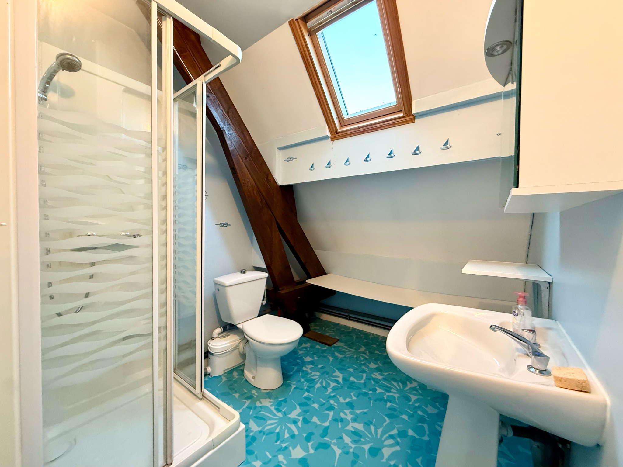 Au deuxième étage : un couloir desservant une salle d'eau avec WC, deux chambres et un grenier