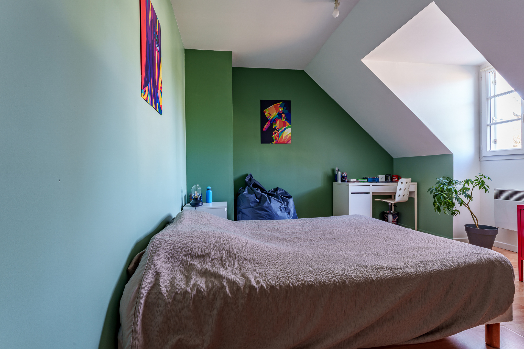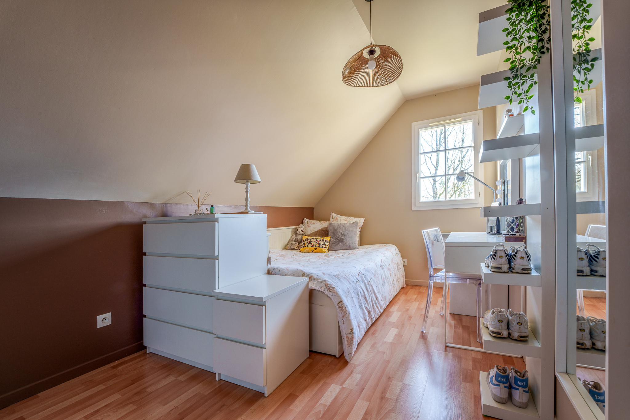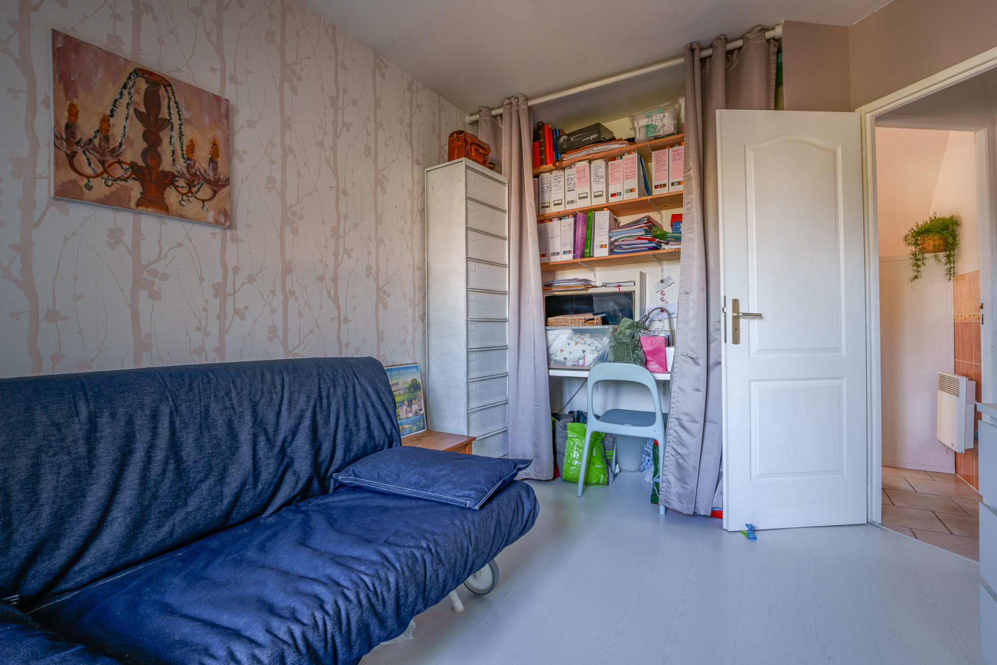 A l'étage : un palier dessert trois chambres, de 9, 8.5 et près de 12m2 (équivalent carrez). La plus grande bénéficie d'un espace bureau, une salle de bains, des wc indépendants.