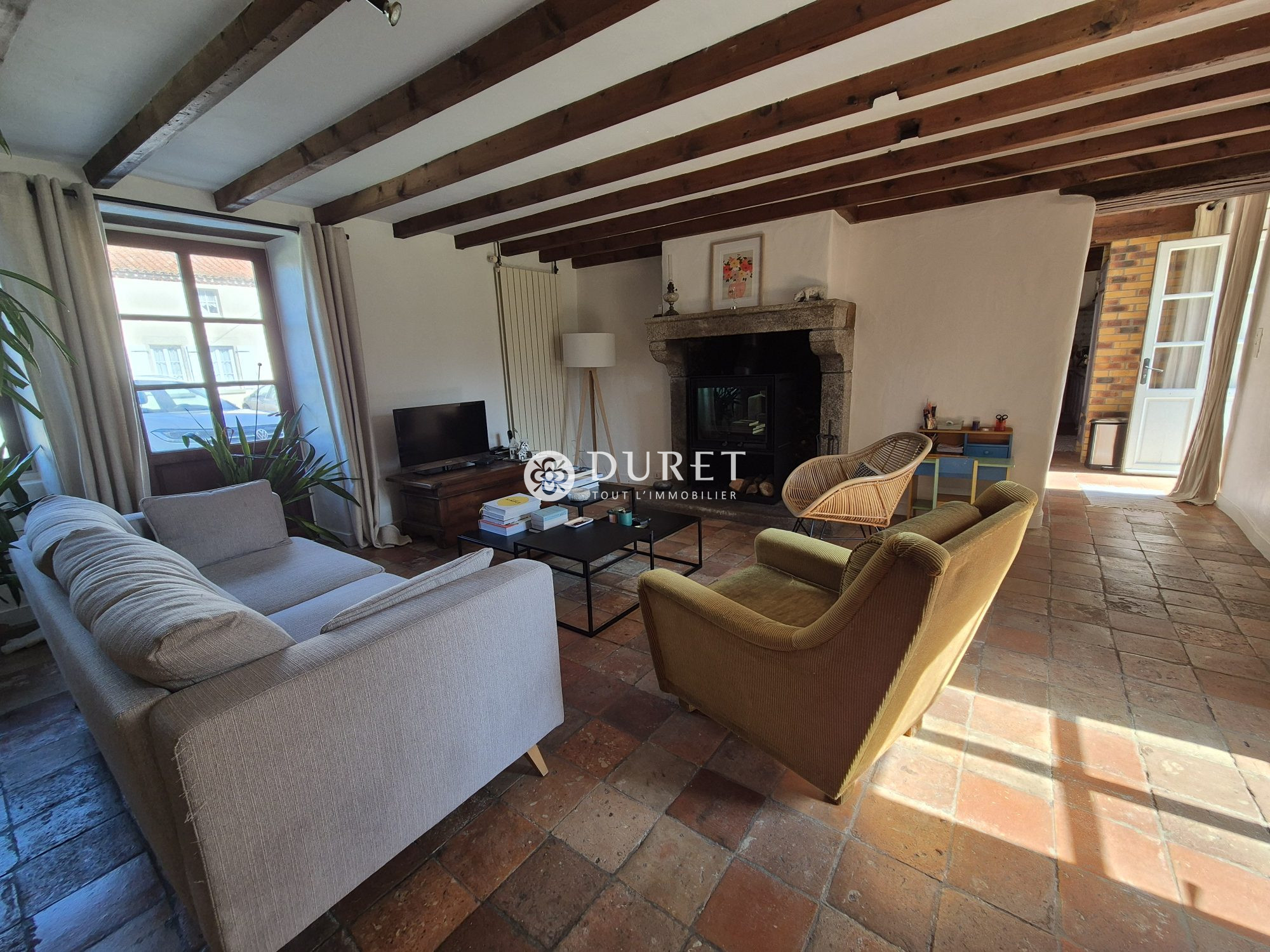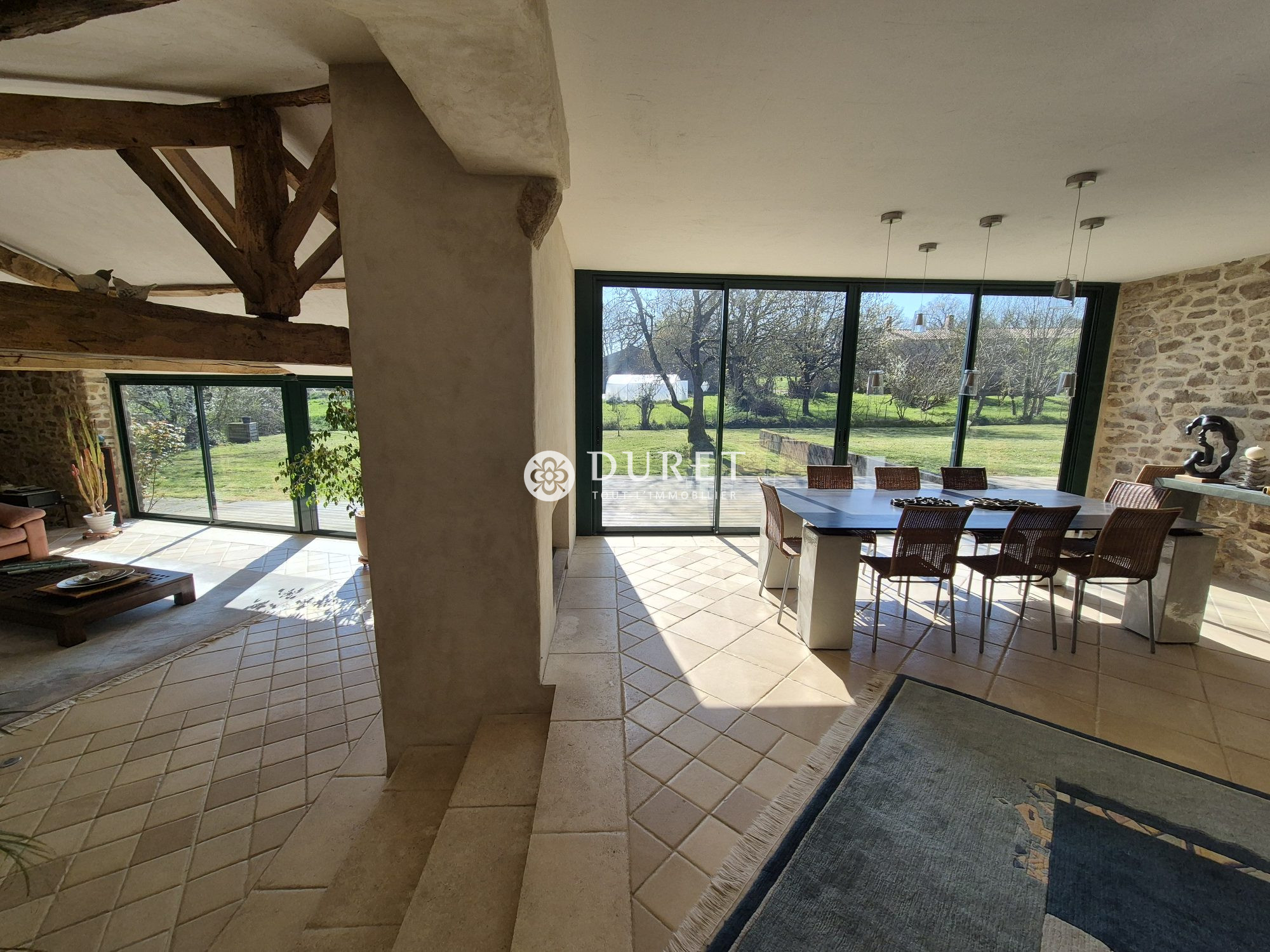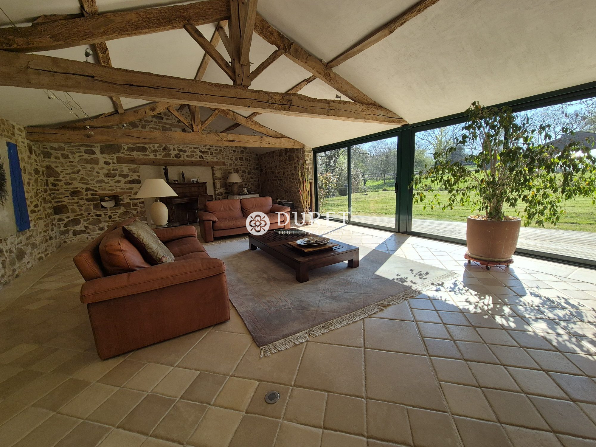 Cette longère marie avec élégance le cachet de l'ancien et le confort du contemporain, dès l'entrée vous serez conquis par une somptueuse pièce des vie d'environ 100 m² baignée de lumière grâce à de larges baies vitrées offrant une vue imprenable sur la campagne environnante. Une superbe cheminée centrale vient subtilement séparer le salon de la salle à manger, créant une atmosphère chaleureuse et conviviale.