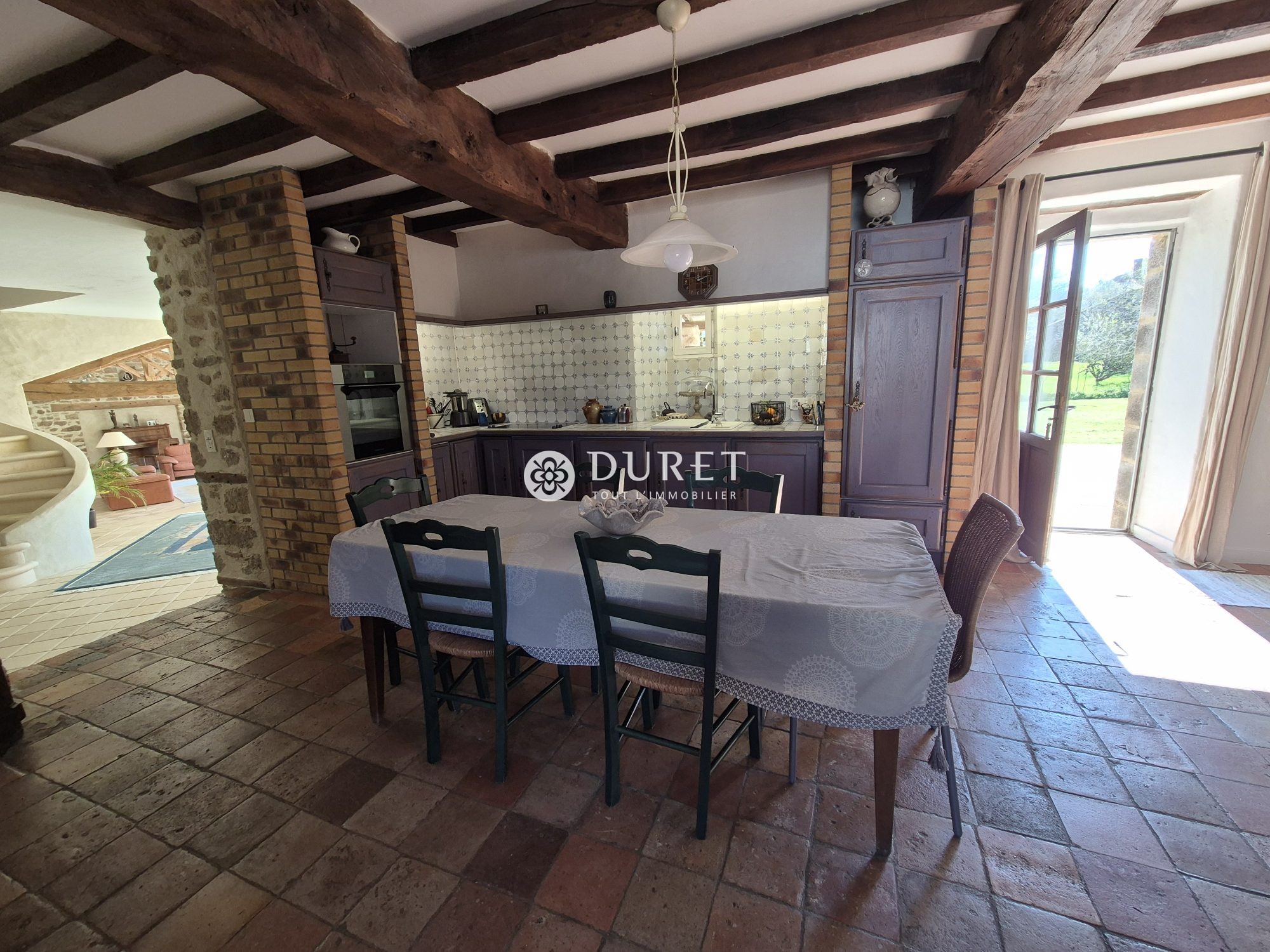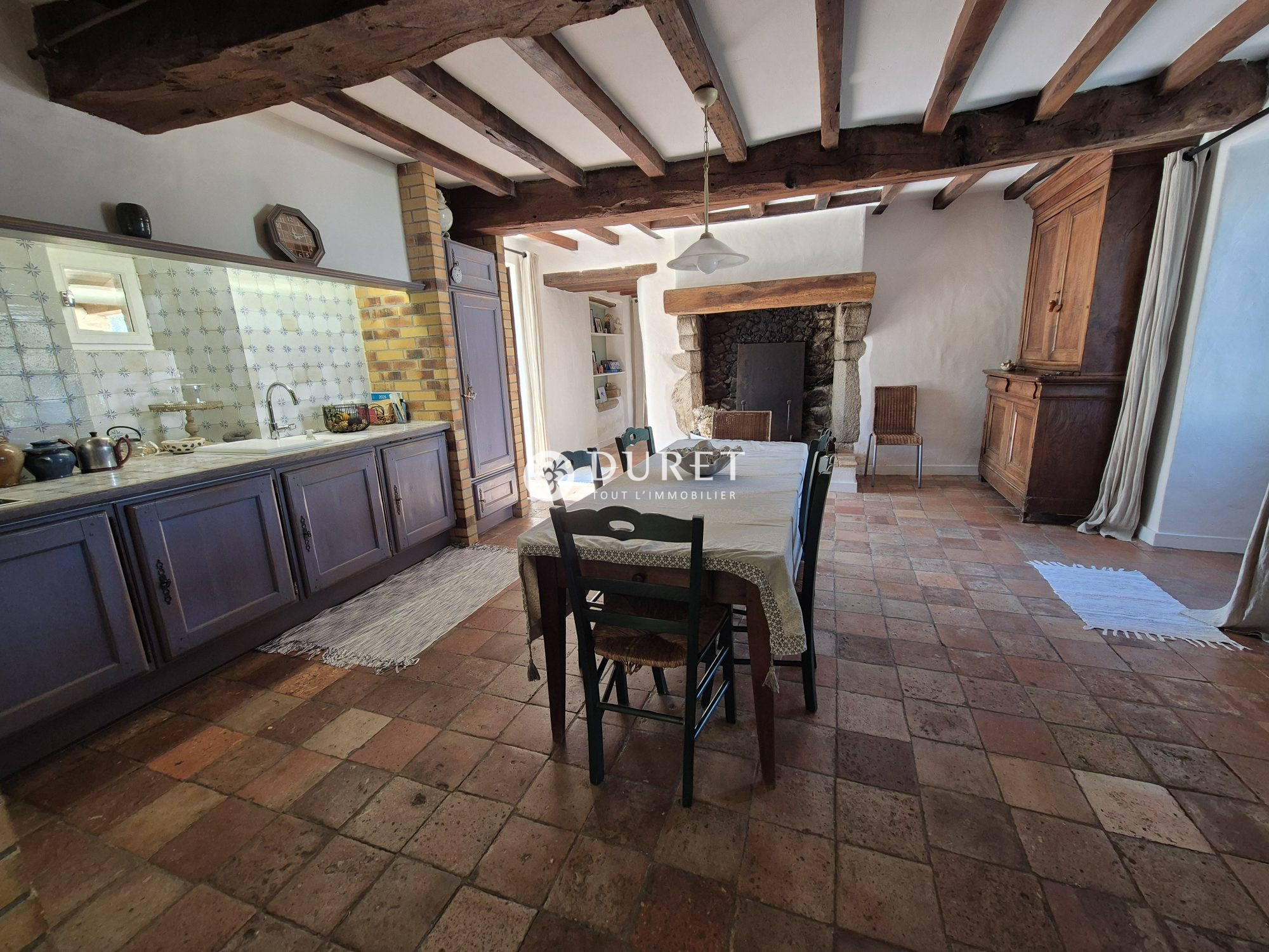 La cuisine aménagée et équipée, spacieuse environ 30 m² et authentique avec sa cheminée et ses poutres, s'inscrit parfaitement dans l'esprit longère, une arrière cuisine la complète.