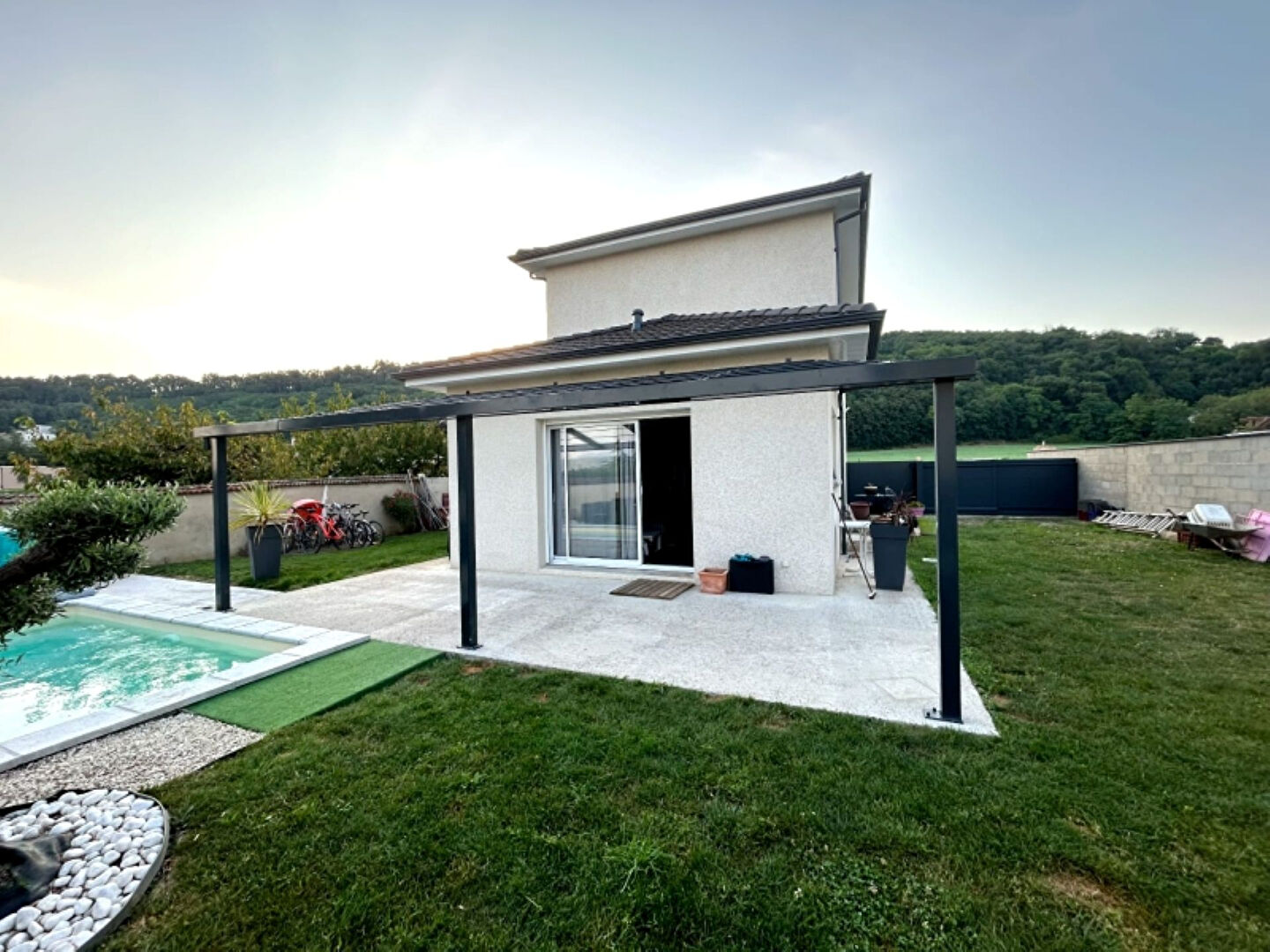 Côté extérieur, vous trouverez un carport de 32m², une terrasse avec pergola et une piscine de 4,5m*2.2m.