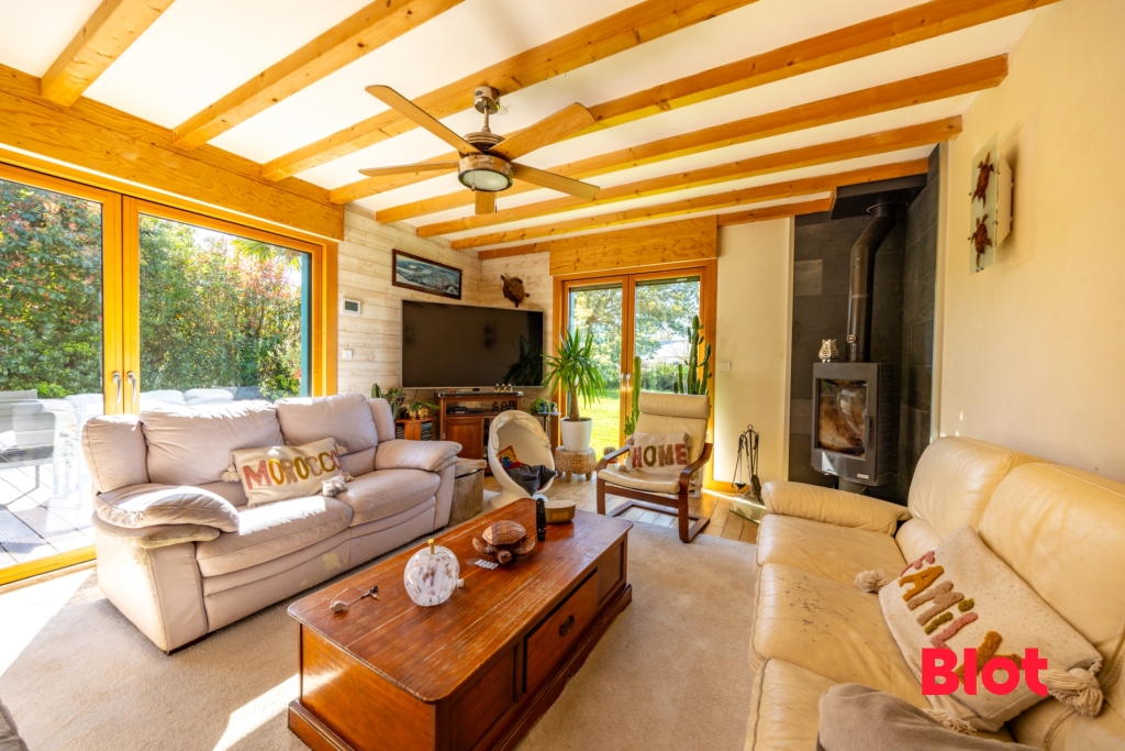 À l'extérieur, vous profiterez d'une agréable terrasse ouverte sur le jardin. Trois garages viennent compléter l'ensemble, offrant de nombreuses possibilités de stationnement, de stockage ou d'aménagement selon vos besoins.