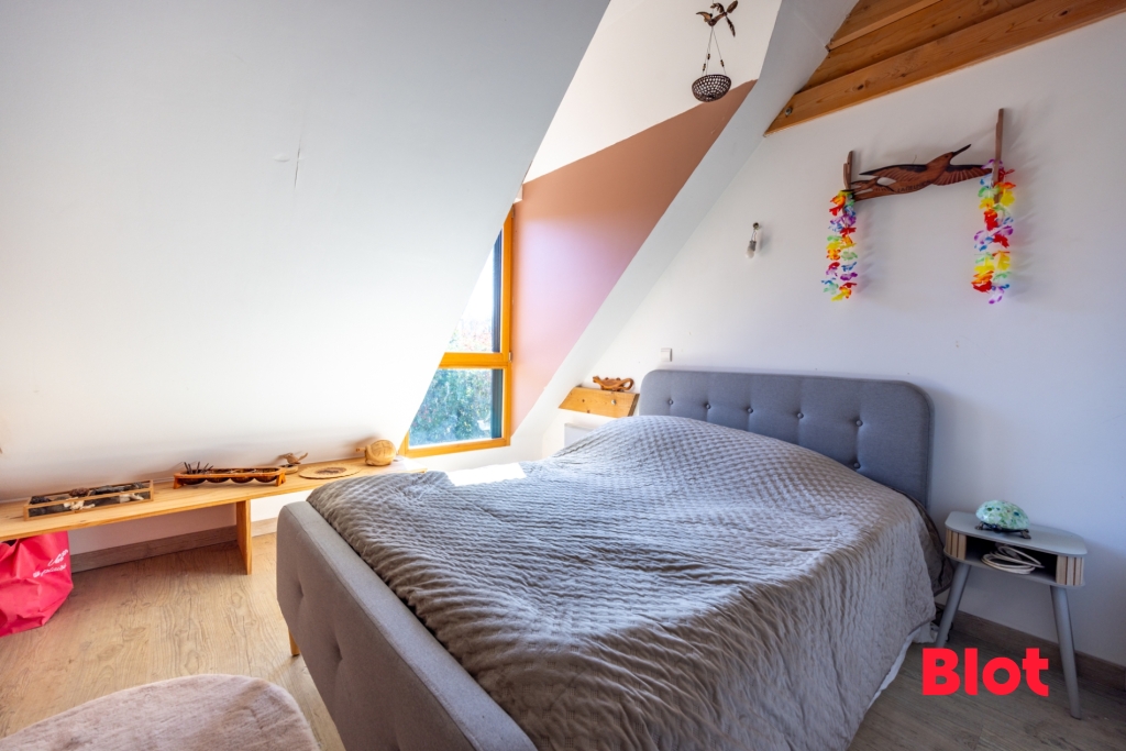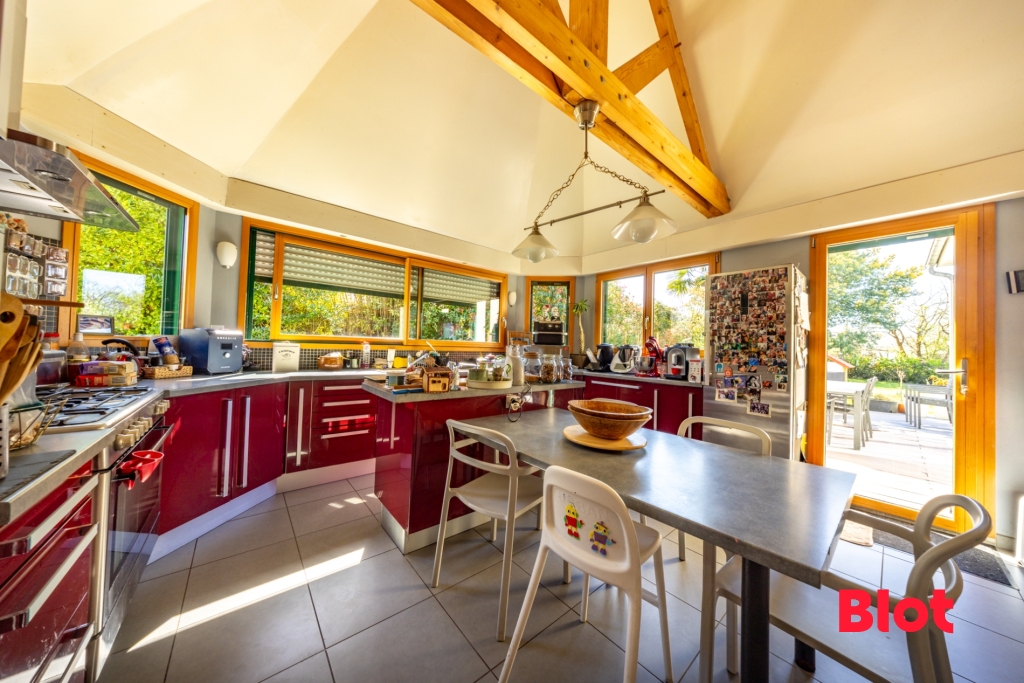 Dès l'entrée, vous découvrirez une maison familiale aux volumes généreux et à l'agencement fonctionnel. Le rez-de-chaussée propose une entrée avec placard, un bureau idéal pour le télétravail, ainsi qu'une belle pièce de vie salon-séjour chaleureuse agrémentée d'un poêle à bois. La cuisine aménagée et équipée, complétée par une arrière-cuisine, offre un espace convivial et pratique au quotidien. Une chambre avec placard et salle d'eau privative permet une vraie vie de plain-pied. Une buanderie et des WC complètent ce niveau.