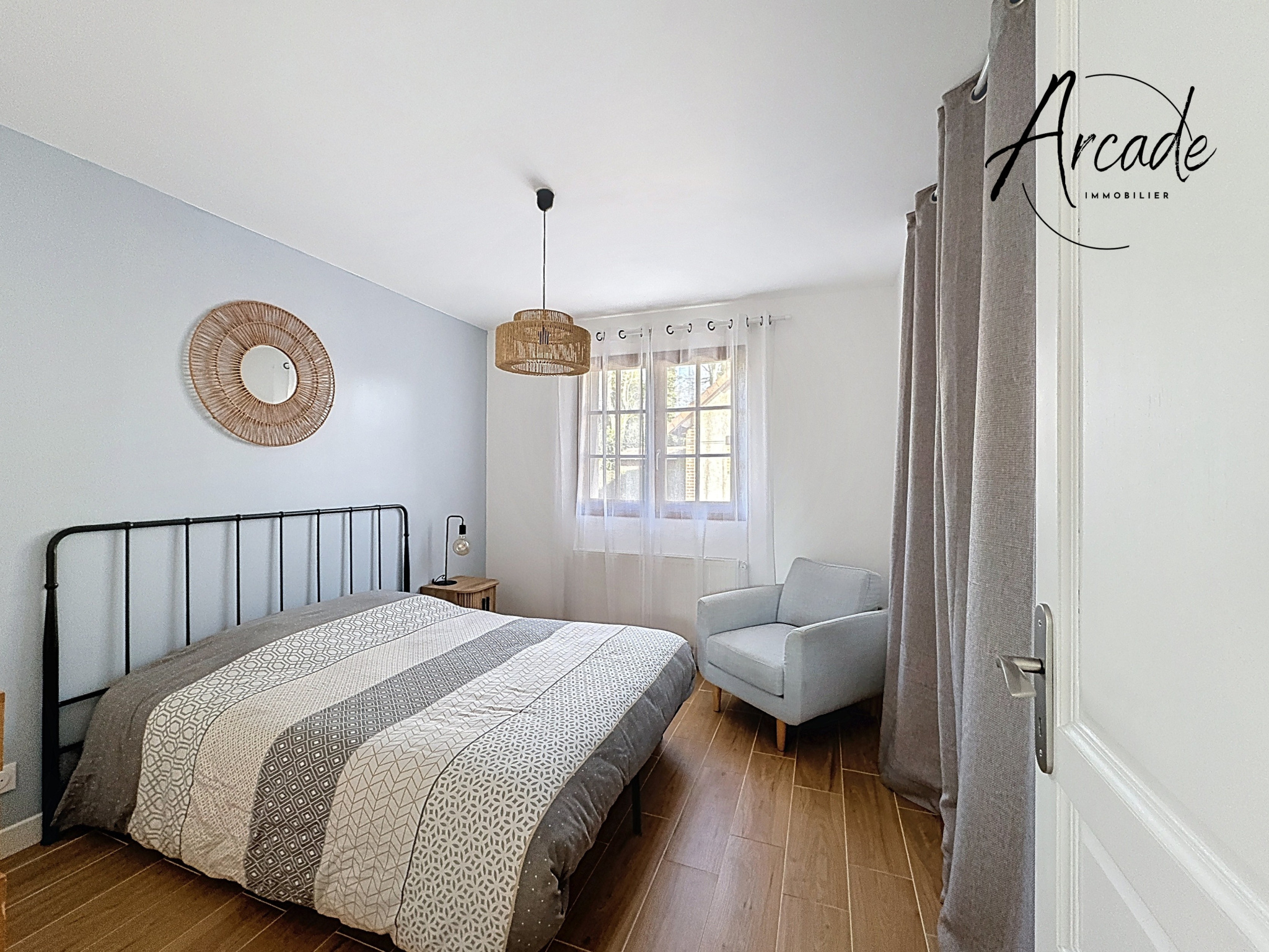 Séjour + cuisine aménagée USA 50 m2 exposé sud, terrasse, 2 chambres avec placards, salle bains + douche, lingerie, wc.