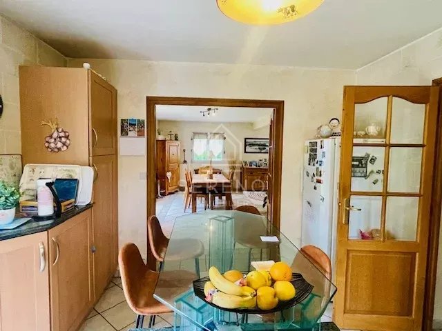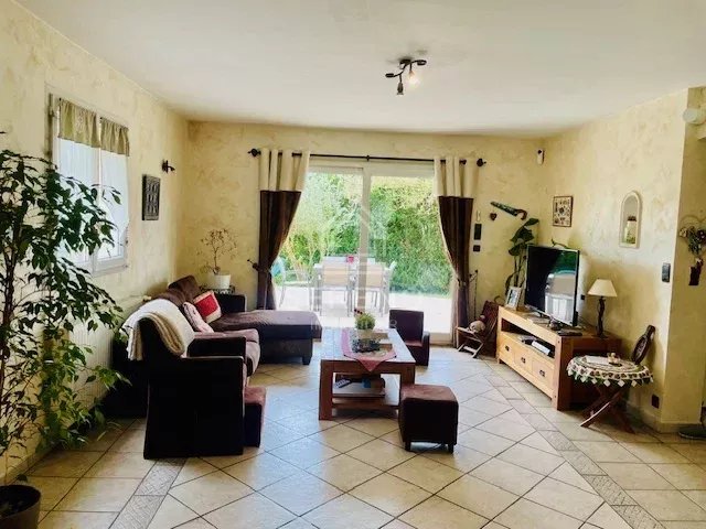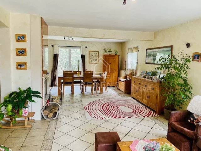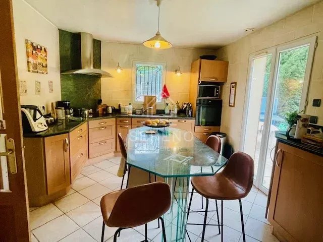 Maison chaleureuse et lumineuse d’environ 150 m2, 8 pièces, circulation fonctionnelle, conviviale. Entrée donnant sur vaste séjour traversant d'environ 45 m2, avec cheminée, un accès direct à deux terrasses, une cuisine aménagée spacieuse, semi-ouverte sur la salle à manger. 1 chambre ou bureau au rez-de-chaussée. À l'étage accessible par un vaste escalier avec rambardes et grilles en fer forgé : grand palier avec filet aux normes d’aquabranche desservant 3 chambres, environ 12,5 m2, environ 14,5 m2, et chambre parentale environ 17,5 m2, avec balcon, salle de bains avec grande baignoire d’angle, toilettes séparées.