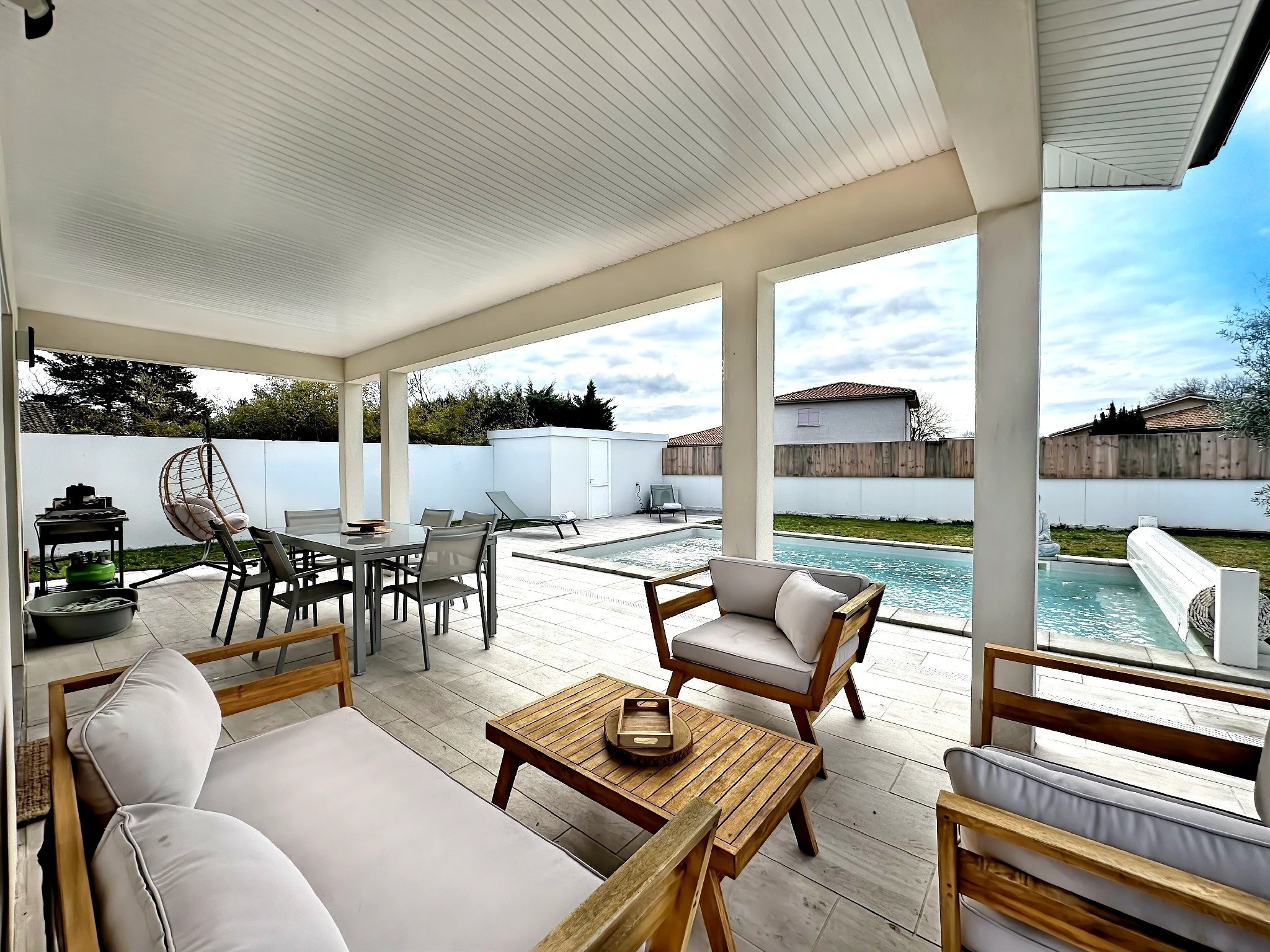 Une grande pièce à vivre bien exposée ouvrant sur une terrasse couverte carrelée qui prolonge l'espace de vie, une cuisine ouverte aménagée et équipée, une arrière-cuisine aménagée et équipée, double vitrage et chauffage au sol