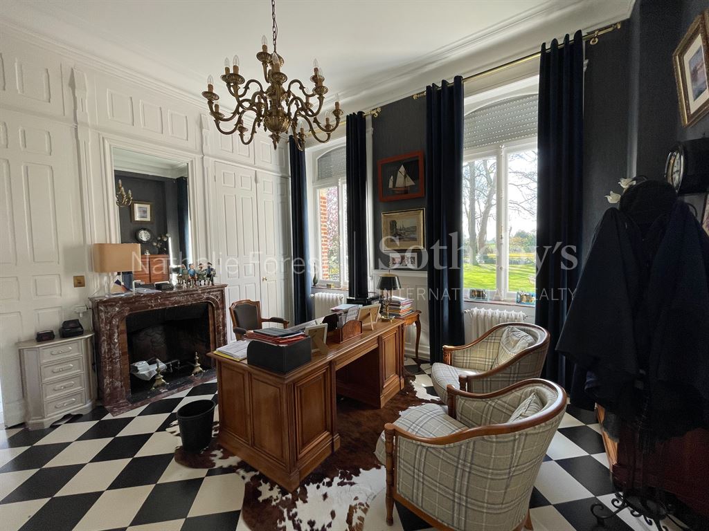 Cette propriété d’exception s’ouvre sur un hall d’entrée majestueux, baigné de lumière, menant à une remarquable pièce de réception traversante de 70 m² avec cheminée à feu de bois. Les larges ouvertures offrent une vue imprenable et apaisante sur le parc. La cuisine indépendante, entièrement équipée, allie fonctionnalité et raffinement. Un vaste bureau complète ce niveau.
