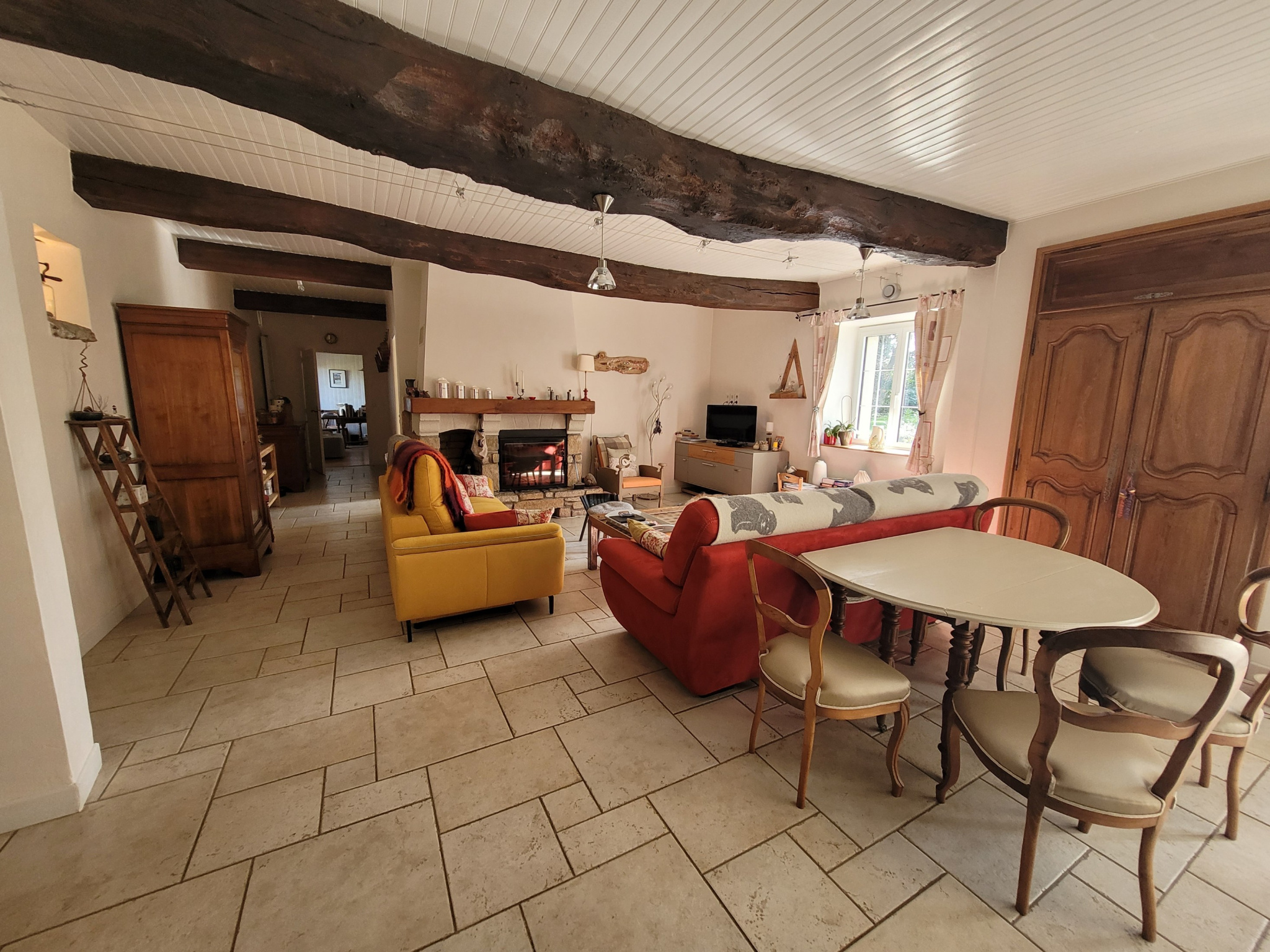 Côté confort, la maison bénéficie d'équipements récents : pompe à chaleur air/eau, isolation des combles, menuiseries double vitrage, garantissant une classe énergétique favorable.