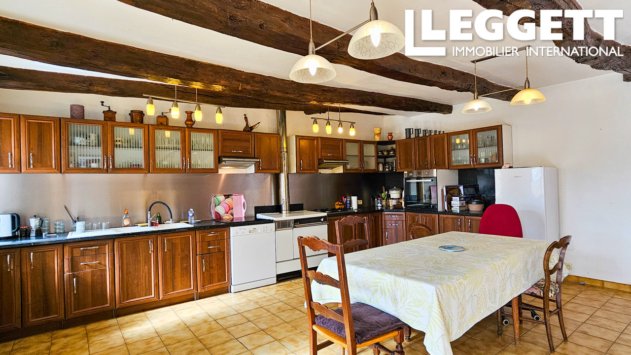 Celle-ci mène à un vaste espace de vie ouvert comprenant un séjour/salle à manger et une cuisine aménagée et équipée (cuisinière à bois, four électrique, plaques de cuisson gaz/vitrocéramique). Attenants, une buanderie, des WC séparées, une cave et une salle de bains avec baignoire balnéo et douche.