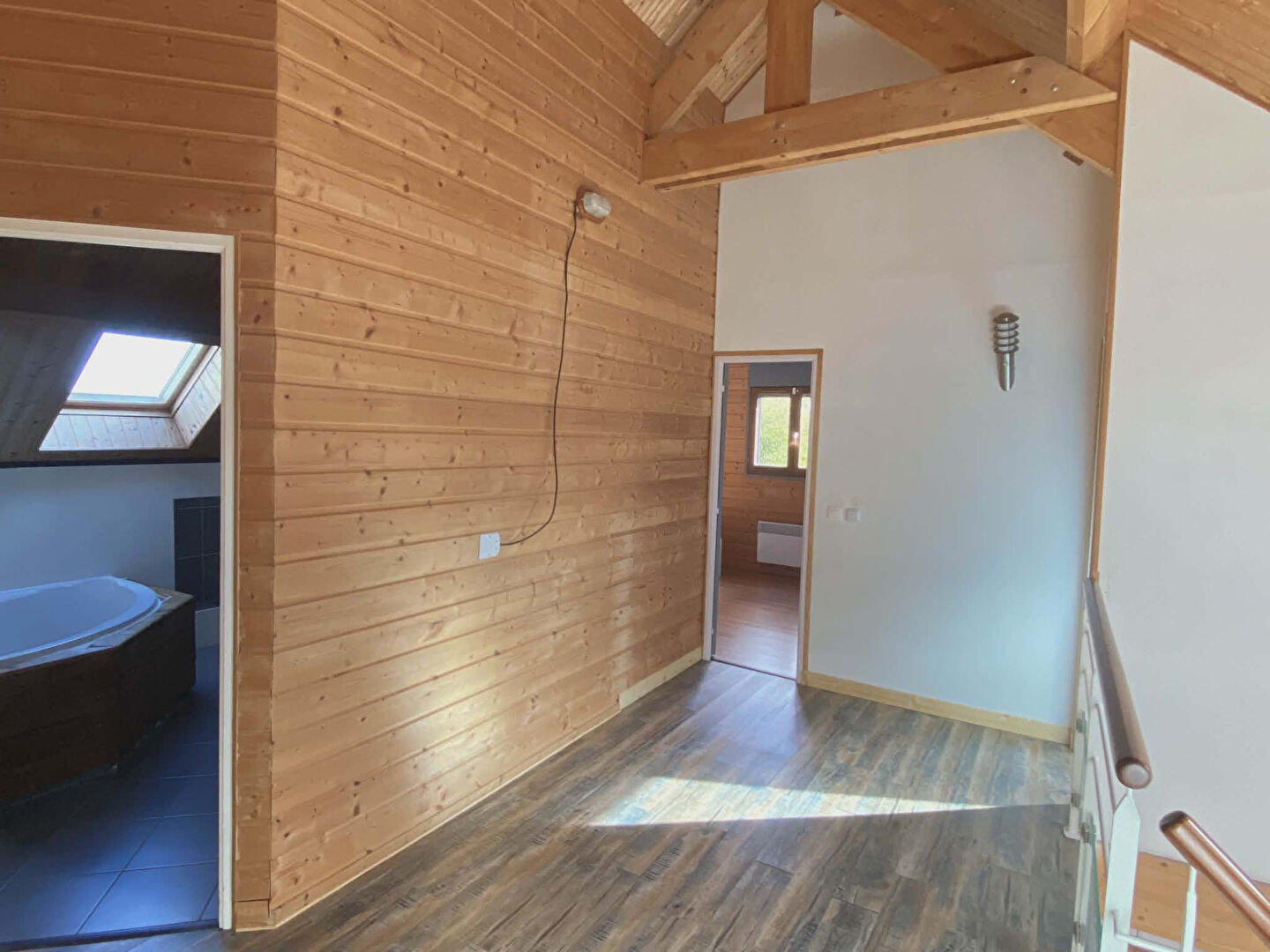 A l'étage : Une grande mezzanine desservant 4 chambres dont une avec une mezzanine. Une salle de bain avec un WC.