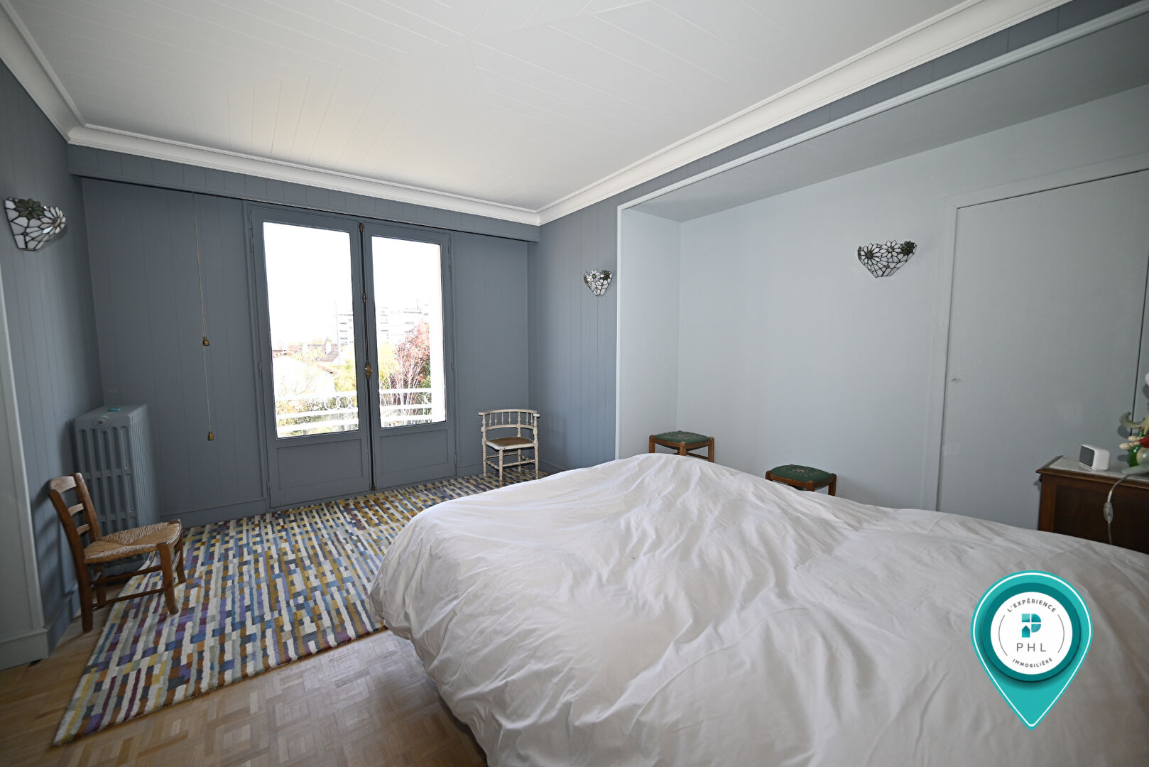A l'étage : couloir desservant 2 chambres dont une avec double dressing et balcon donnant sur le jardin, et salle de bains avec baignoire et WC. Trappe d'accès au grenier.