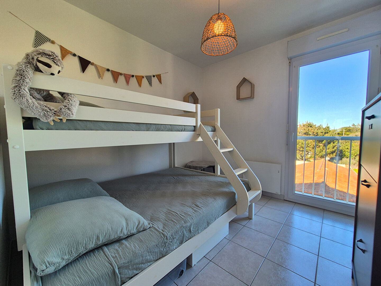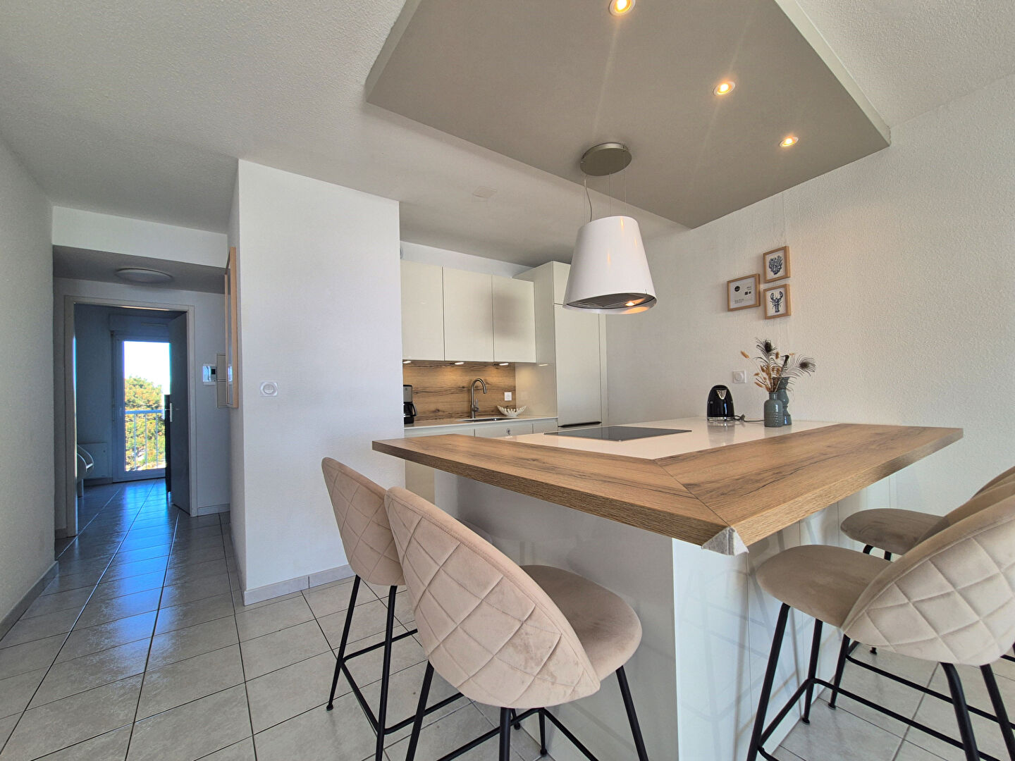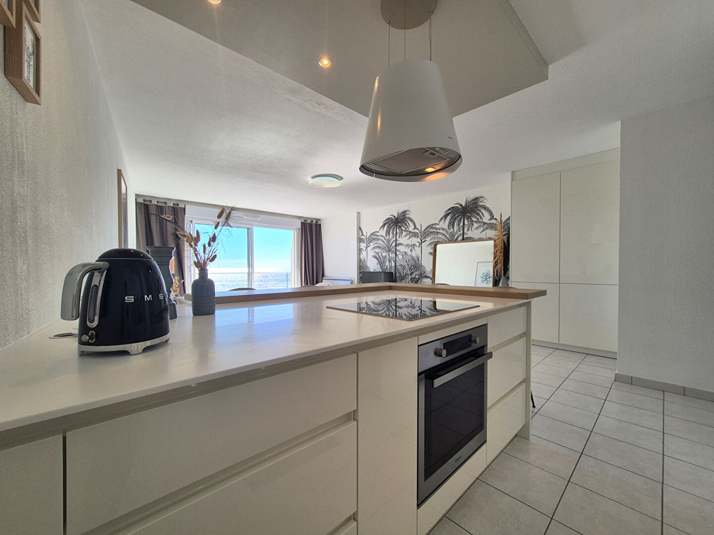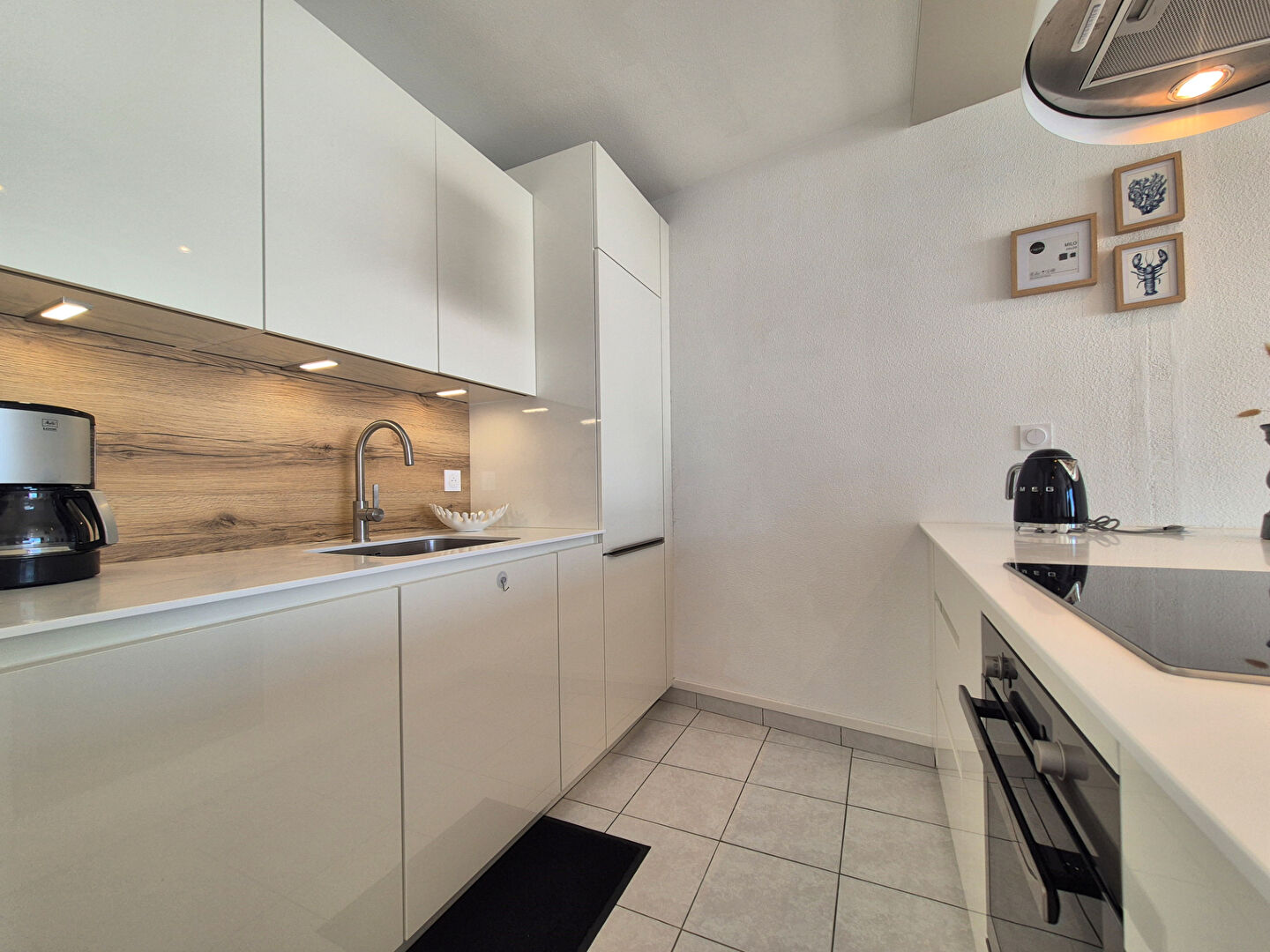 Il se compose d'une entrée, d'un grand séjour très lumineux ouvrant sur la terrasse face à la mer où prendre ses repas et profiter de la vue, d'une cuisine haut-de-gamme aménagée et équipée, deux chambres avec grands placards, une salle d'eau et wc séparé.