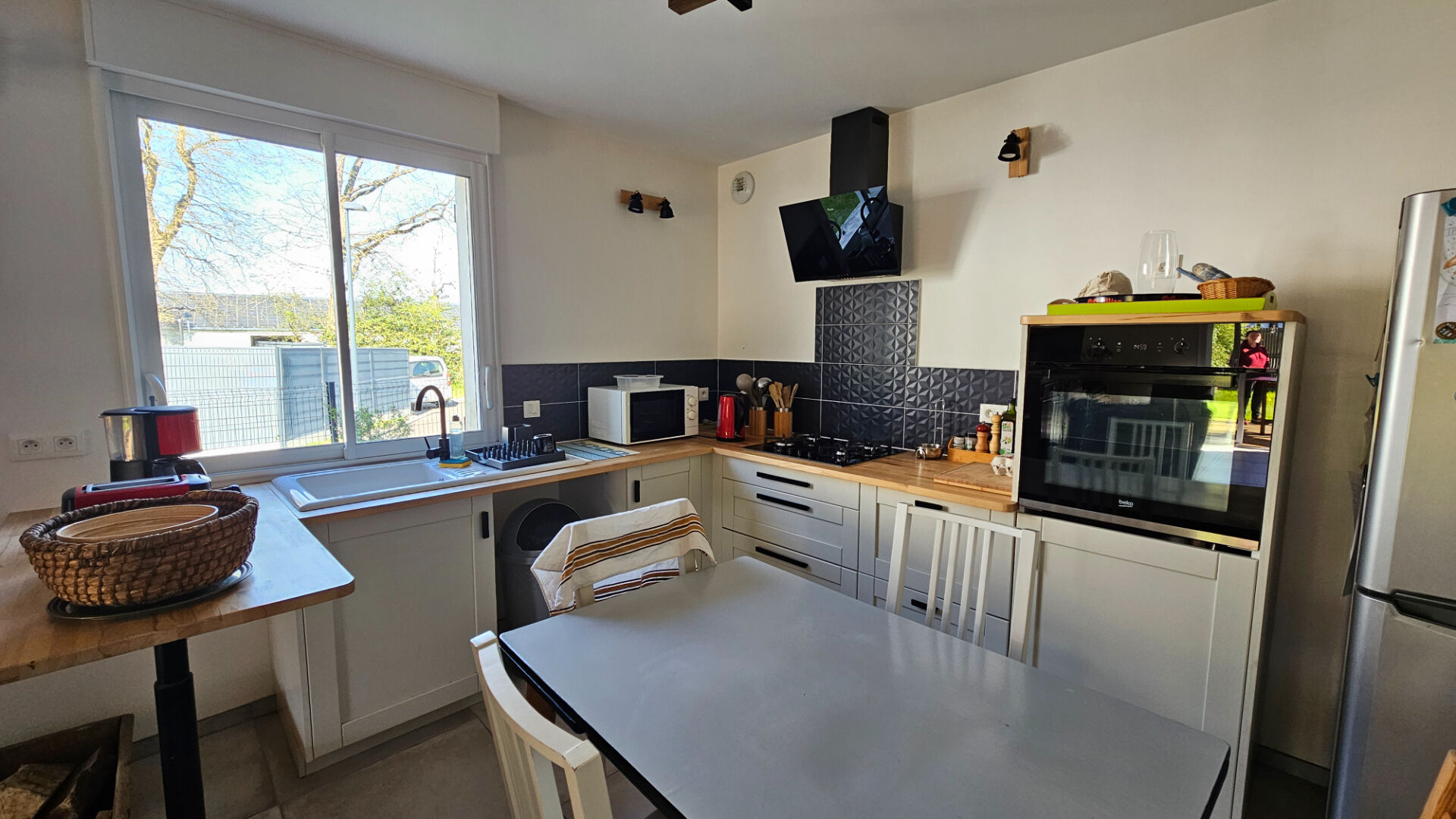 Elle se compose d'un agréable salon-séjour ouvert sur une terrasse idéale pour profiter des beaux jours. L'espace de vie est agrémenté d'un poêle, apportant confort et convivialité en toute saison. La partie nuit offre deux belles chambres, deux salle d'eau