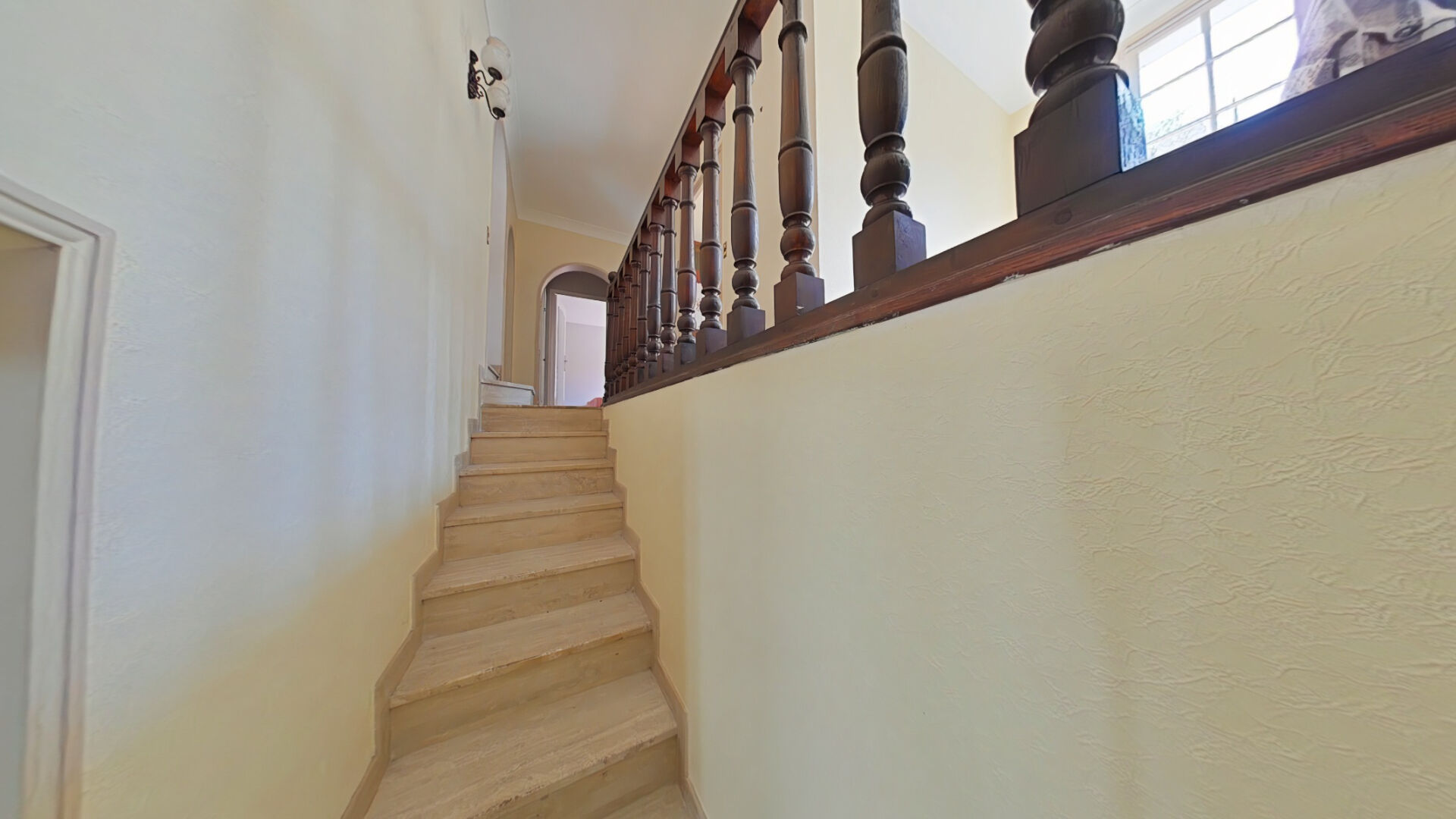 Le corps principal de la maison se déploie sur deux niveaux : en partie basse, une entrée, une chambre avec poutres apparentes, salle de bains et WC. À l'étage, un espace de vie lumineux comprenant séjour, cuisine et chambres, ouvert sur le jardin et bénéficiant d'une agréable exposition Sud. Des chambres supplémentaires sous les toits viennent compléter l'ensemble.