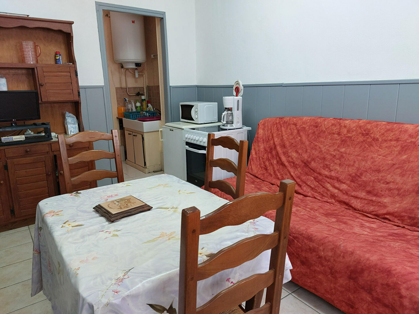 Pièce de vie - petit coin cuisine - chambre - salle de douche - wc