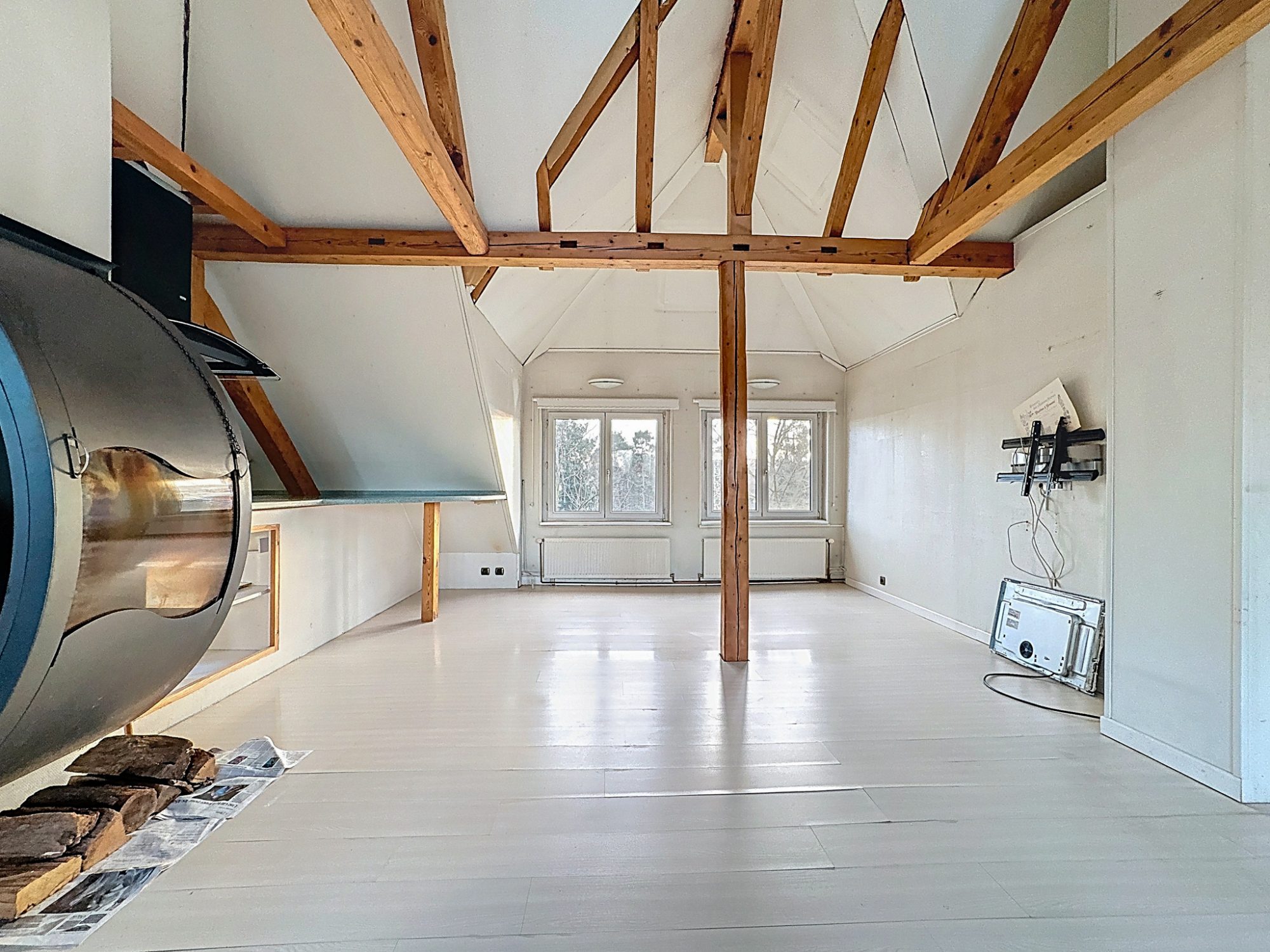 Dans les combles, un salon/salle à manger avec cuisine US et cheminée et une chambre.