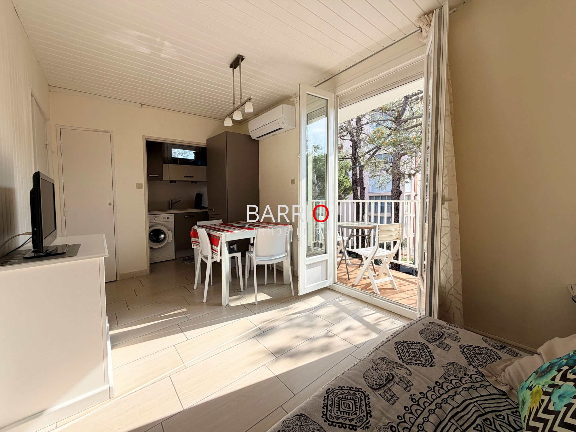 L'intérieur se compose d'une belle pièce de vie lumineuse avec cuisine ouverte, donnant sur un agréable balcon permettant de profiter d'un aperçu sur la mer. L'appartement dispose également d'une grande chambre avec placard, avec un balcon côté chambre offrant une vue sur les Albères. Une salle d'eau avec wc complète l'ensemble.