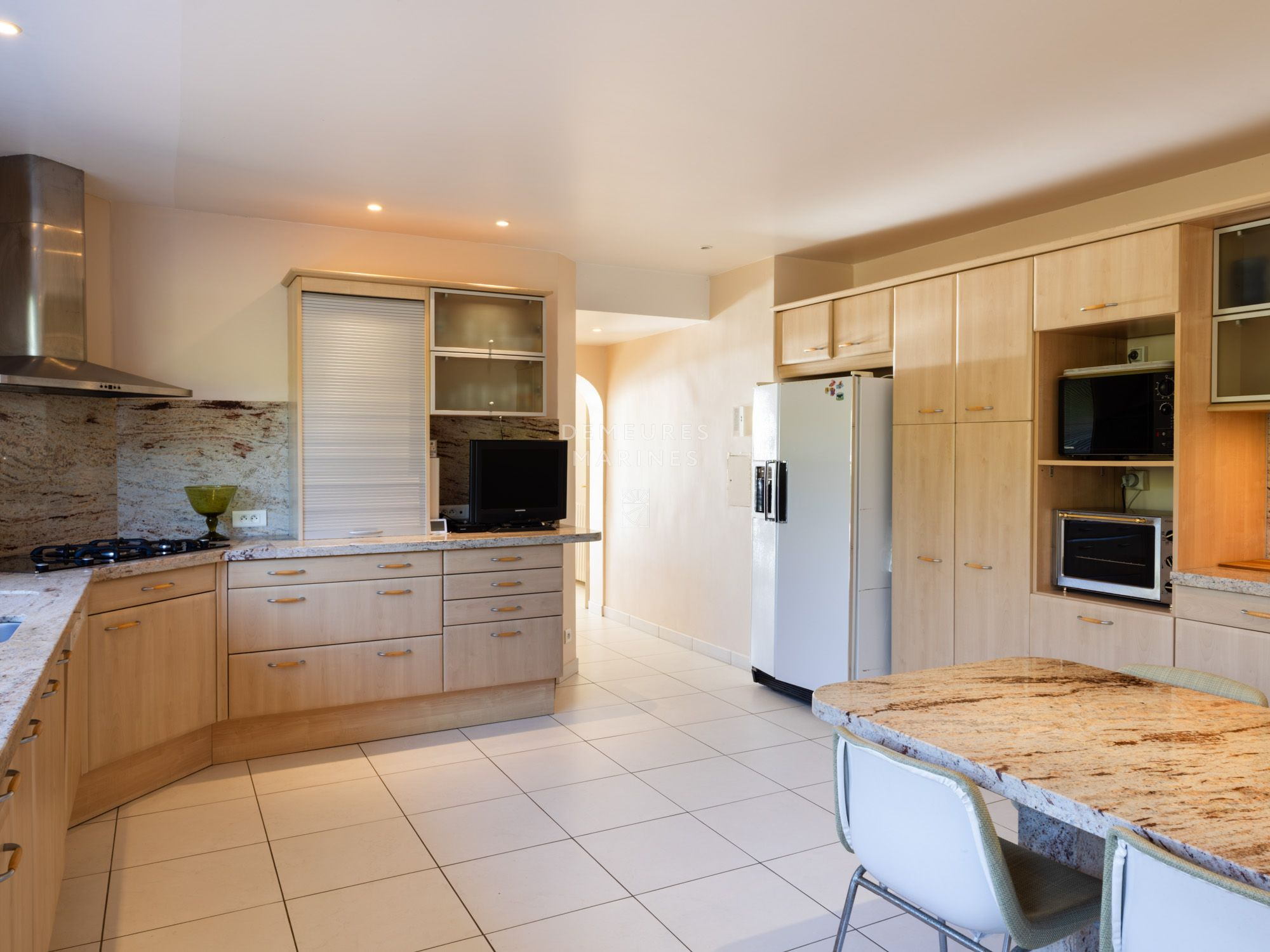 Au rez-de-chaussée, les espaces de réception, ouverts sur la terrasse avec la mer pour horizon, s'organisent autour d'un salon-séjour cathédrale animé par une cheminée en pierre. La cuisine aménagée et équipée, prolongée par une cuisine d'été et un patio, composent un ensemble convivial dédié aux moments partagés. Une arrière-cuisine et une lingerie complètent l'ensemble.
