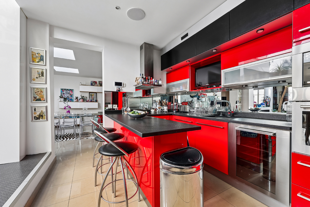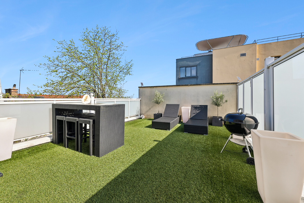 Vous trouverez à ce niveau un espace cuisine complémentaire donnant accès à une seconde terrasse de plus de 30m² exposée plein sud, offrant une vue dégagée sur Paris, avec un panorama rare incluant la Tour Eiffel.