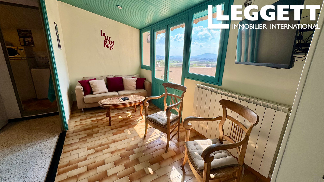 À côté de la cuisine ouverte se trouve un petit salon confortable dont les portes s'ouvrent sur la terrasse ensoleillée orientée sud. L'endroit idéal pour prendre l'apéritif en admirant le soleil doré se coucher au-delà des montagnes des Pyrénées méridionales au loin, encadré par les vastes vignobles verdoyants du Minervois.