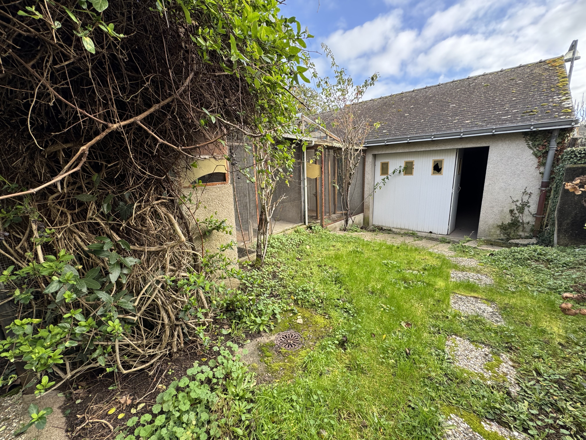 A l'extérieur un jardin avec un garage et plusieurs dépendances.