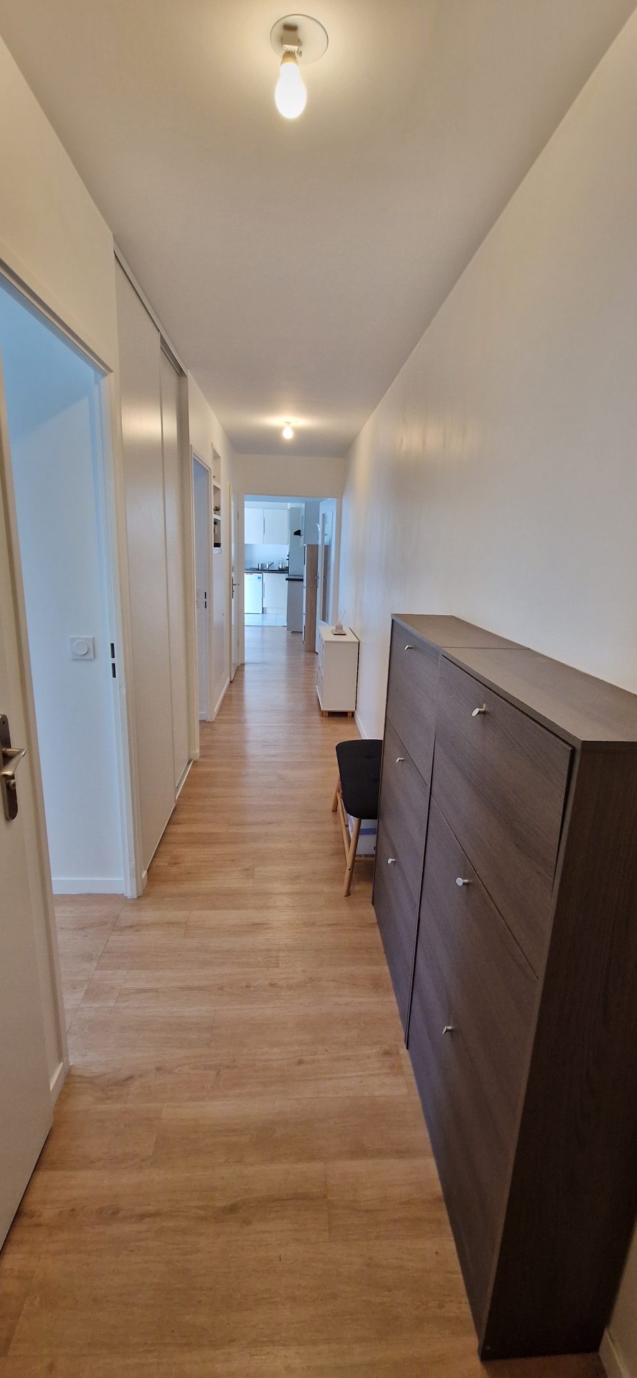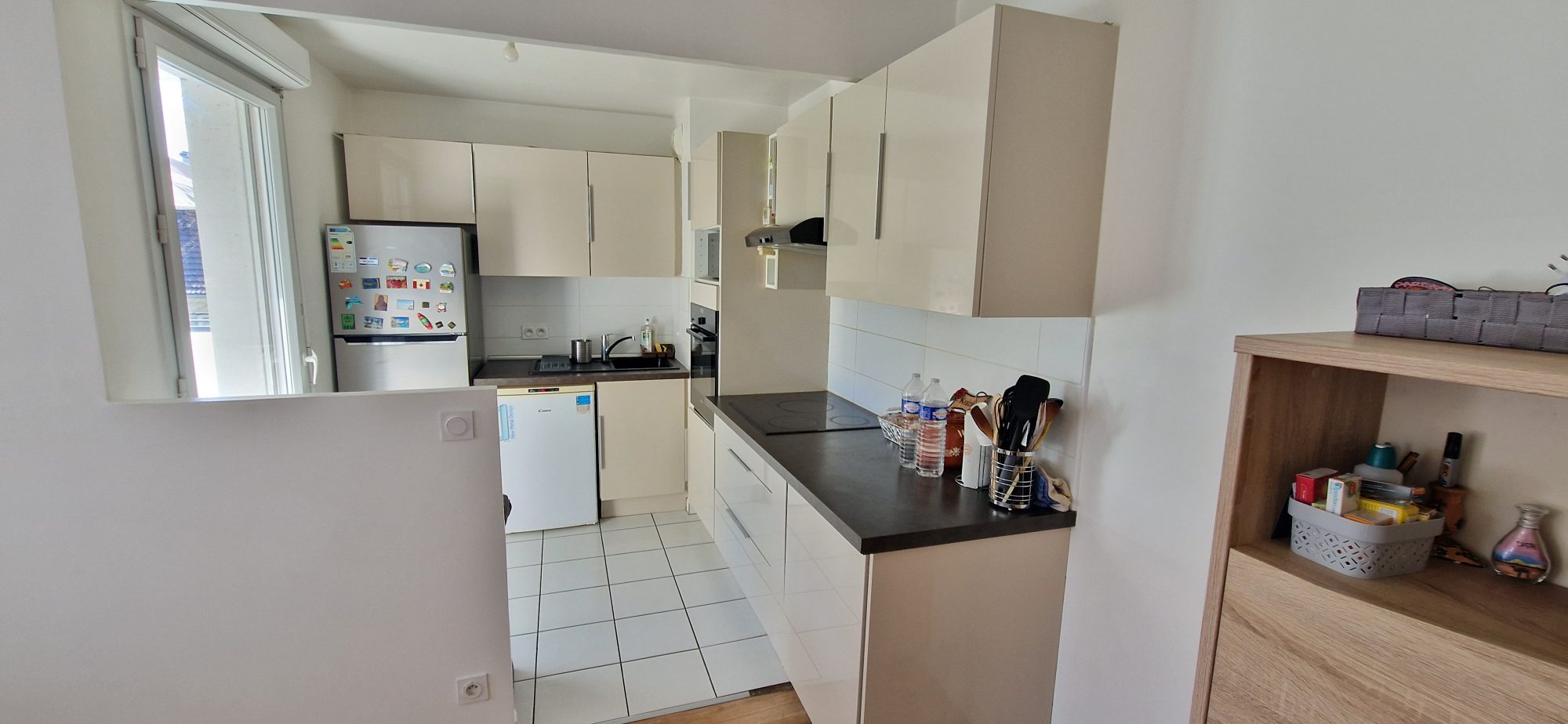 Un appartement trois pièces comprenant: une entrée avec placard, un séjour avec balcon et cuisine ouverte aménagée et équipée, deux chambres et une salle de bain avec une baignoire et un wc.