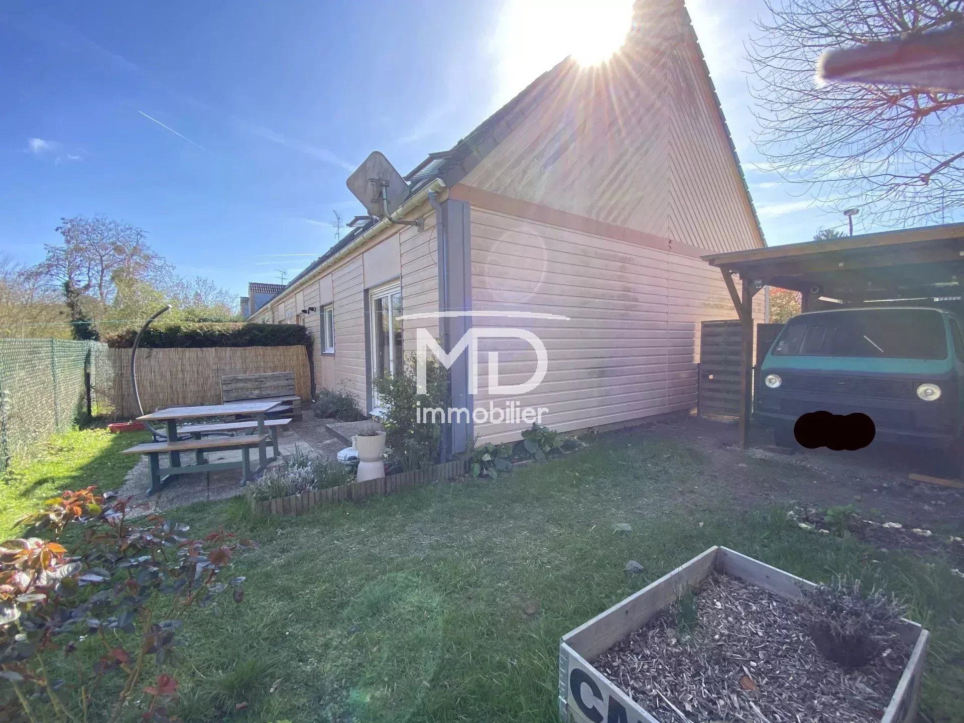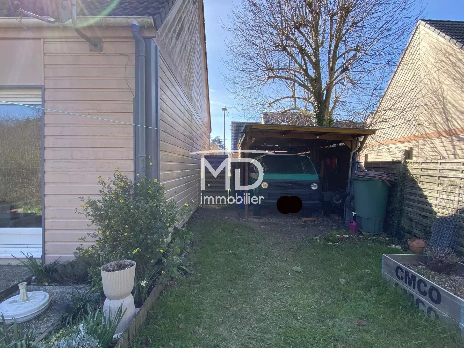 L'ensemble sur un terrain de 215m² environ avec 2 terrasses, carport pour van et 2 places de parking (une devant le garage et une devant le carport).
