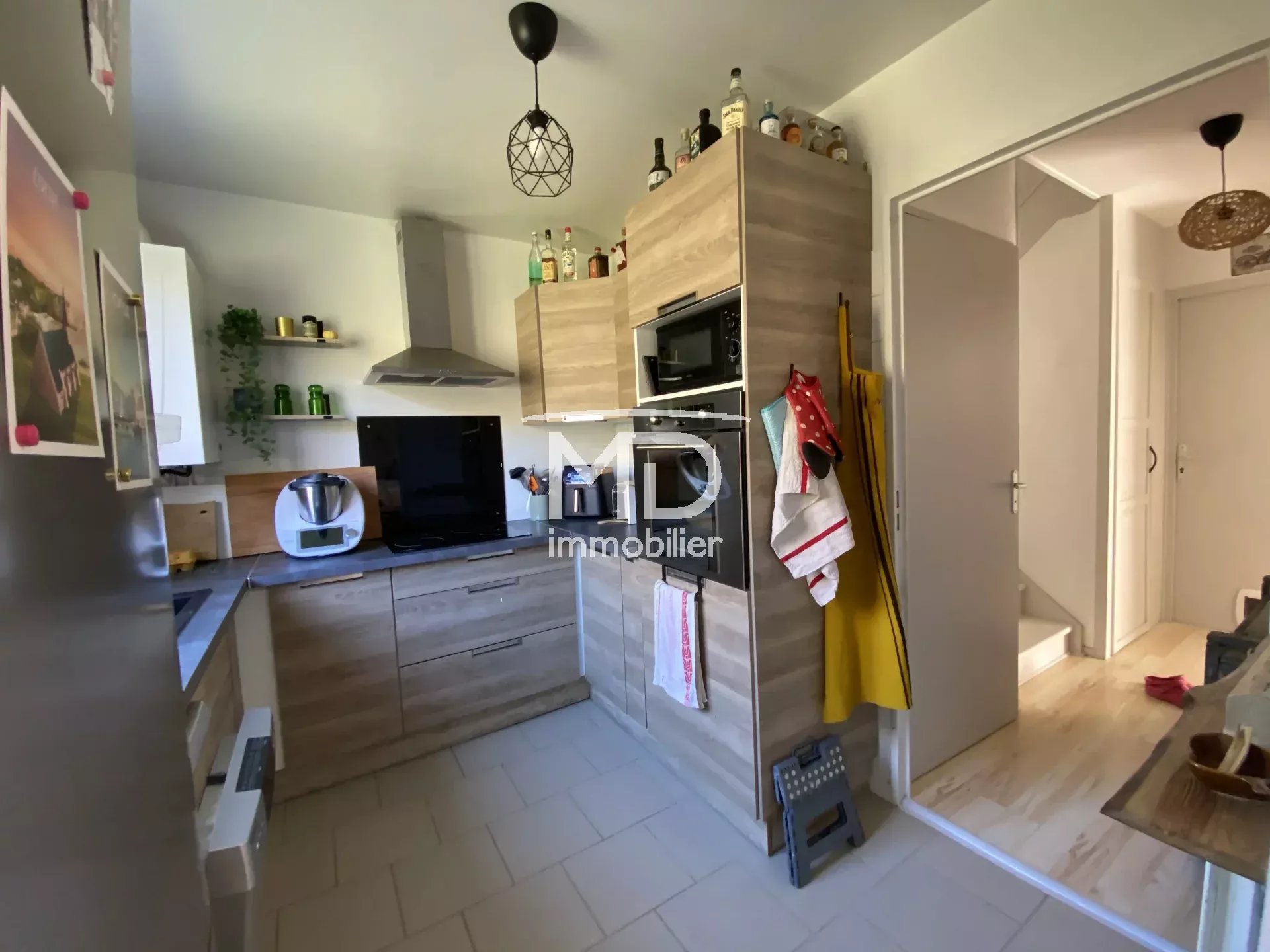 - Au rez-de-chaussée : séjour traversant de 28m² donnant sur terrasse avant et jardin arrière, cuisine aménagée et équipée, dégagement avec placard, WC.