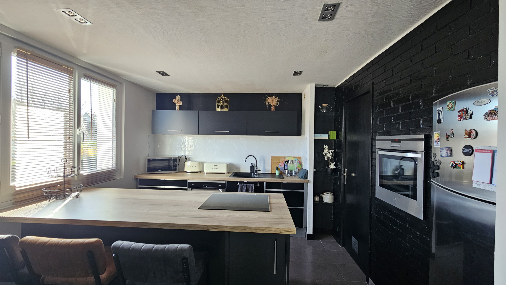 - Entrée avec vaste dressing, une cuisine aménagée et équipée (10, 24 m2) et buanderie attenante, un séjour avec poêle à bois (17, 43 m2), en duplex un salon (15 m2), deux chambres, une salle d'eau, WC.