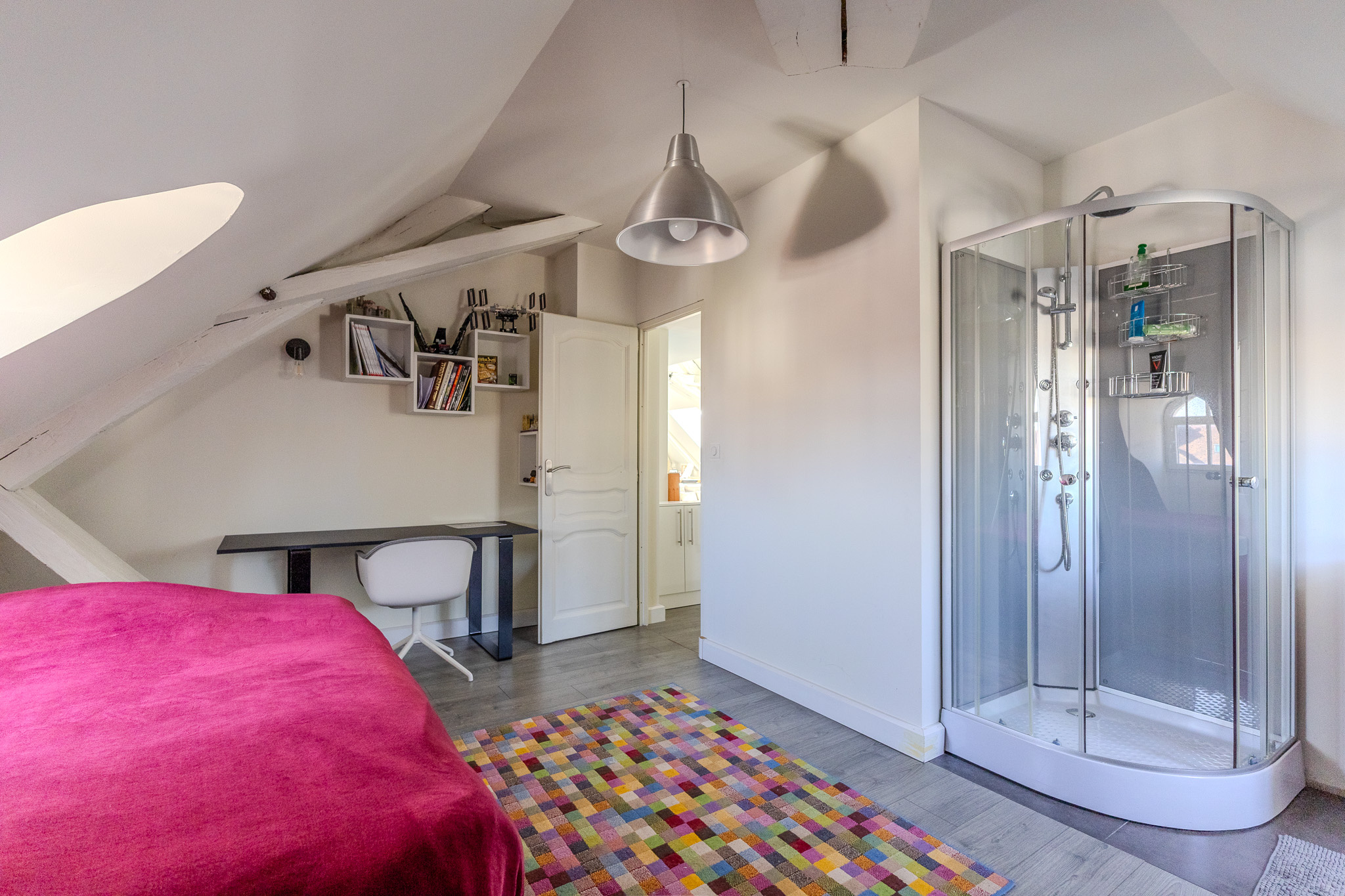 La mezzanine, véritable espace polyvalent peut accueillir un bureau, une salle de jeux ou une chambre d'appoint