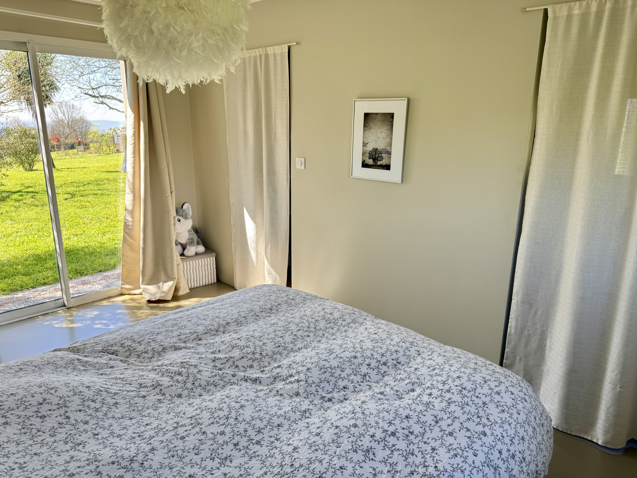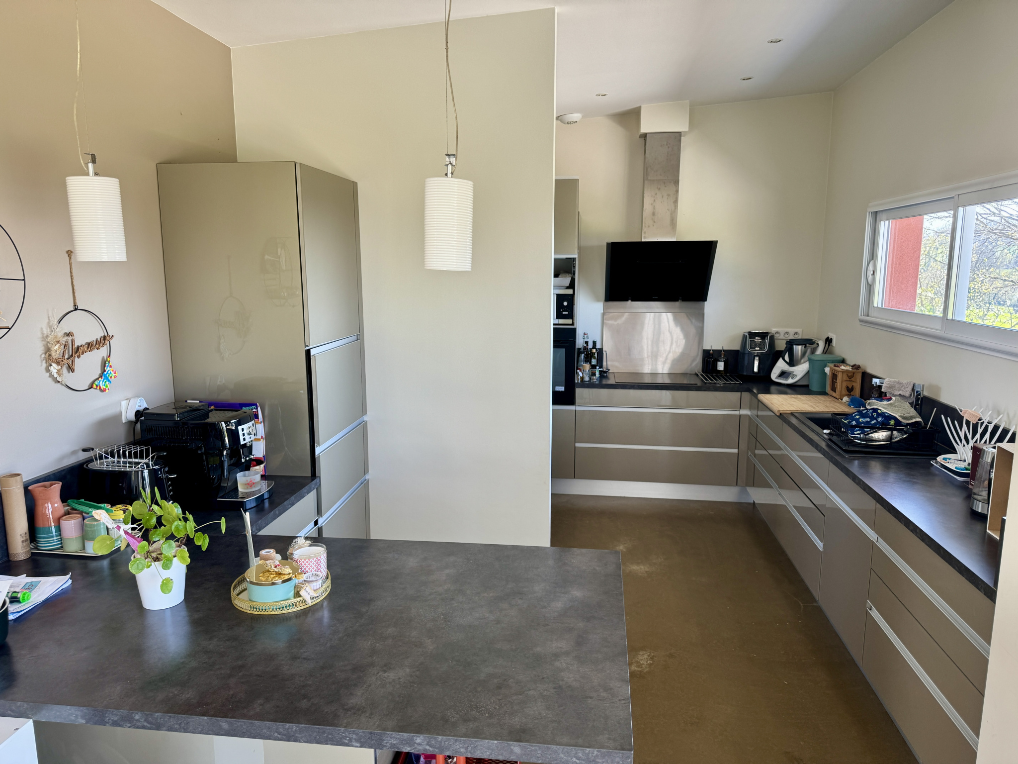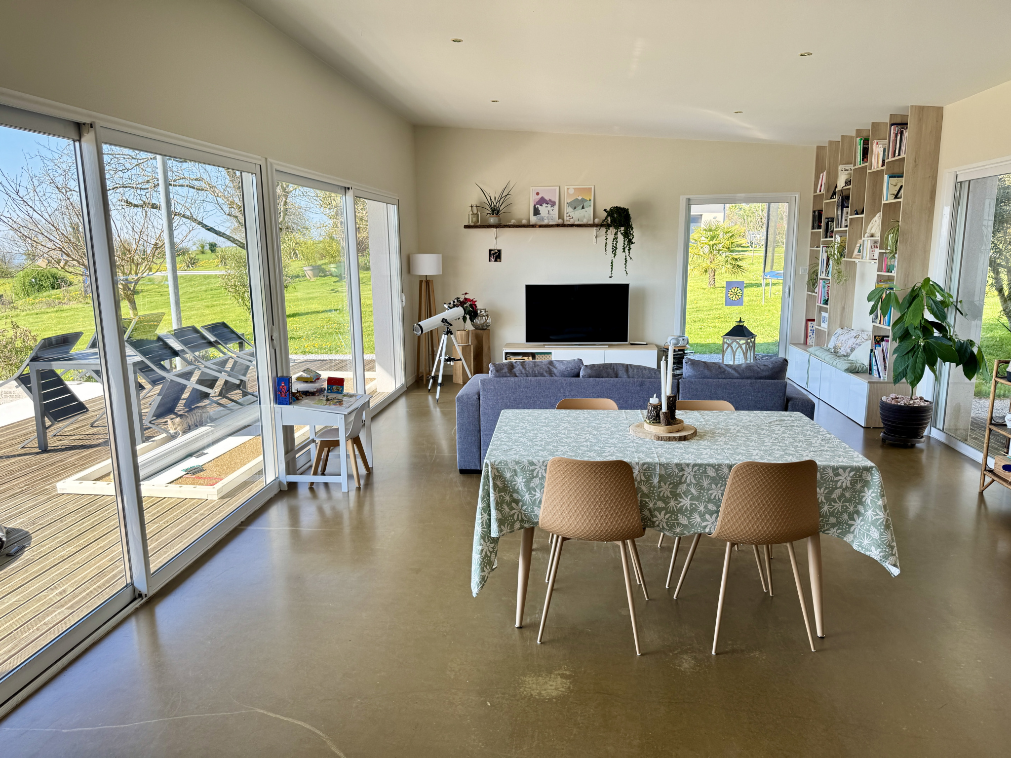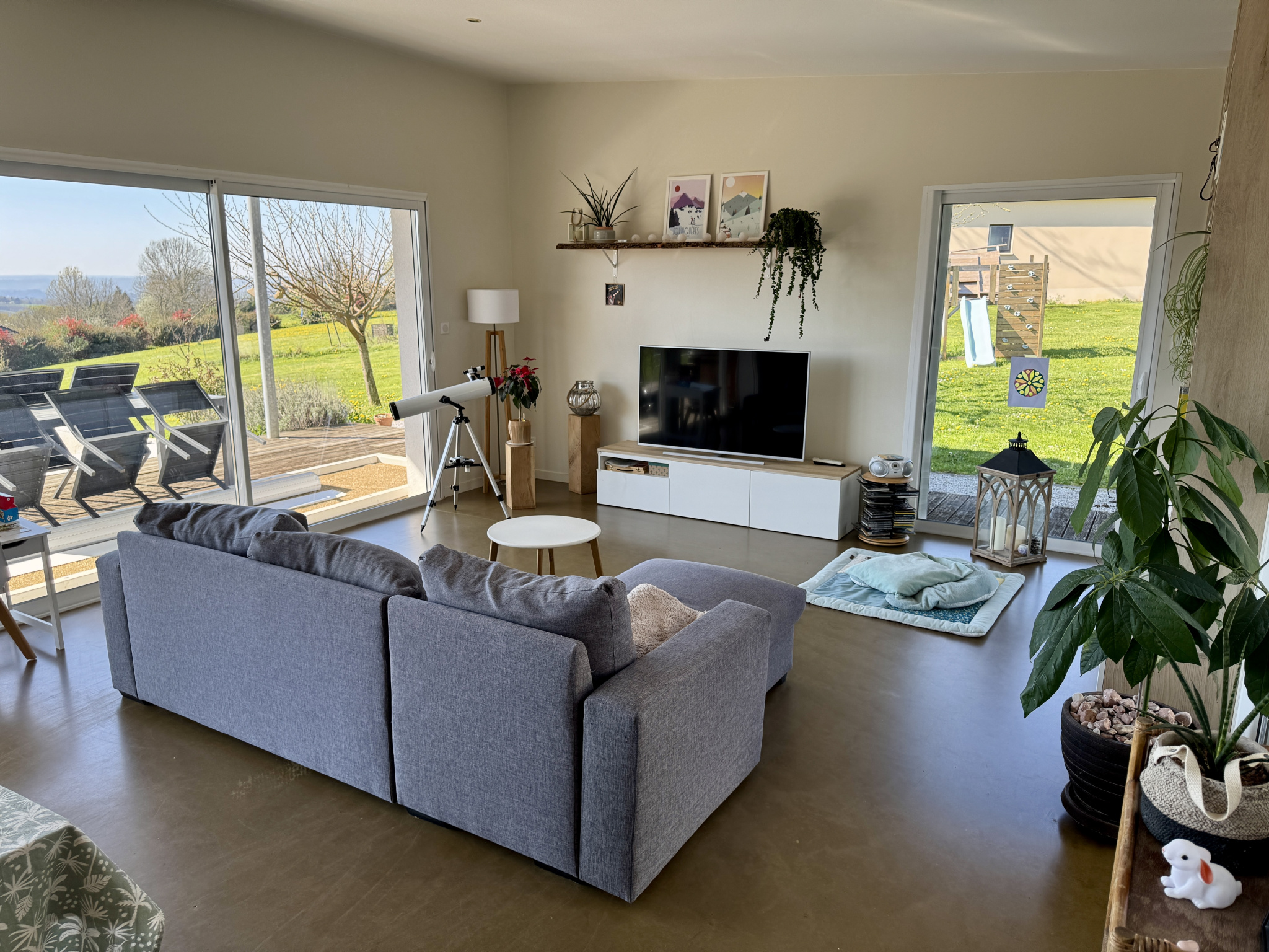Prestations de qualité avec menuiseries double vitrage en aluminium, chauffage au sol par pompe à chaleur, volets roulants électriques.