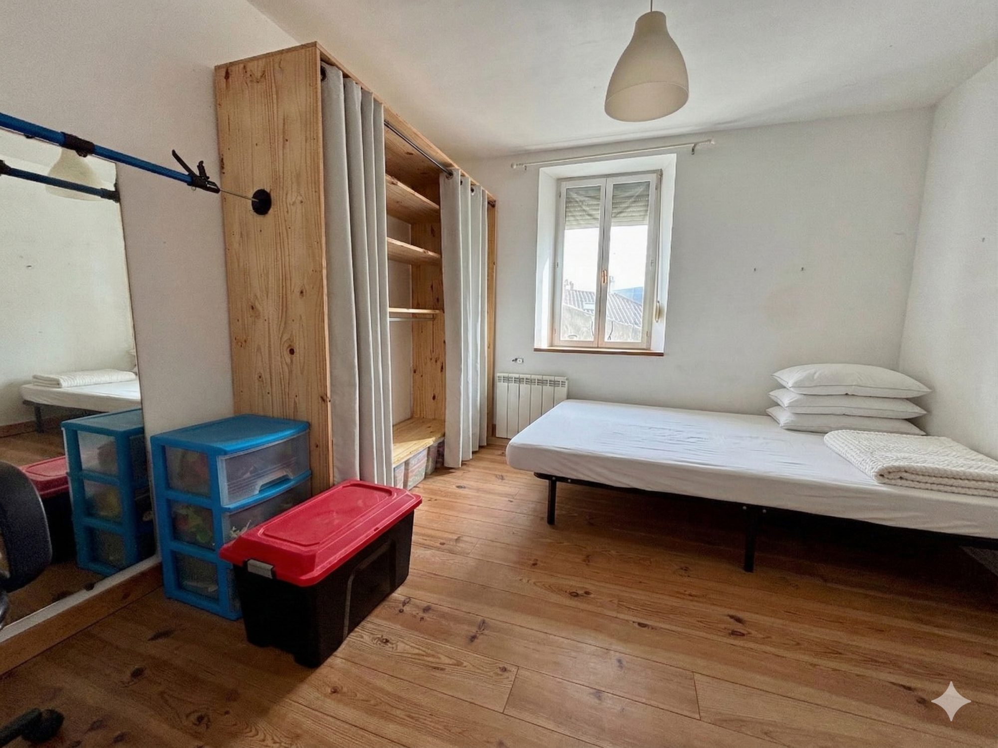 Chauffage électrique complété par une cheminée insert, fenêtres en double vitrage.