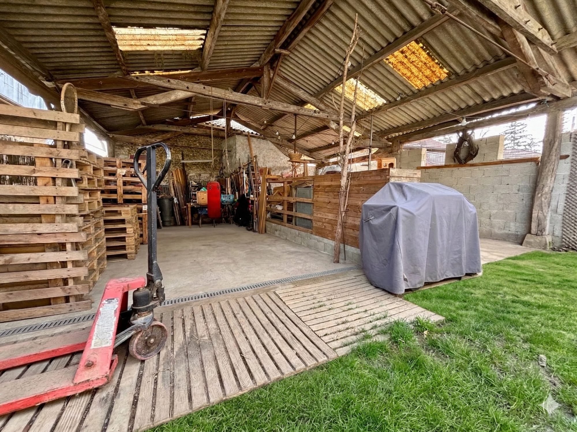 En annexes : Un hangar avec toiture amiantée de 90 m² et une petite cave en sous-sol.