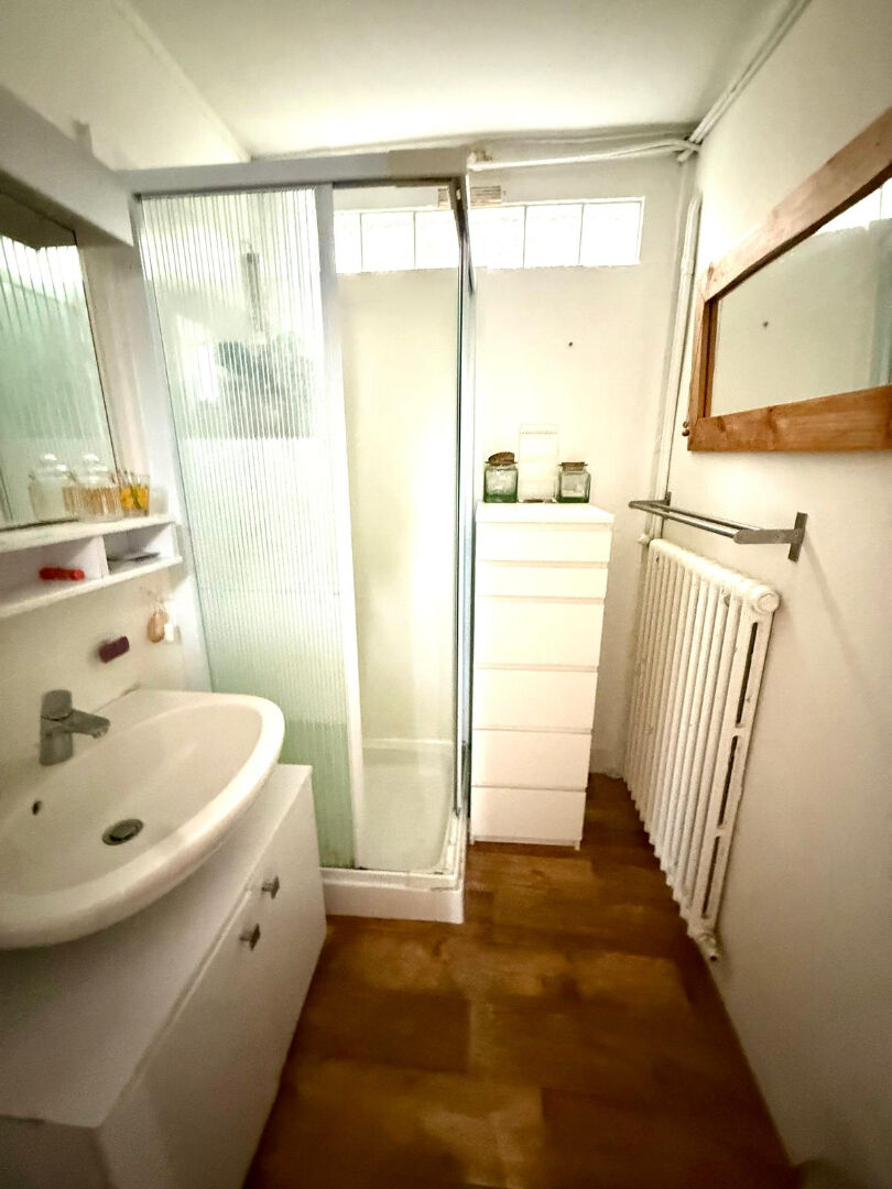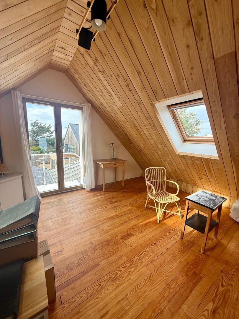 À l'étage, vous découvrirez une spacieuse chambre sous combles bénéficiant d'un accès privatif au jardin et d'une vue mer.