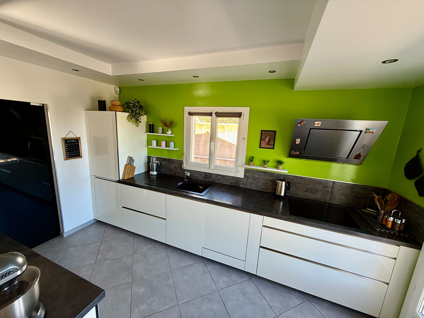 Baignée de lumière, cette maison de plain-pied d'environ 95 m² dispose d'une vaste pièce de vie de 53 m² avec cuisine semi-ouverte équipée et un cellier, s'ouvrant par de larges baies vitrées sur un jardin paysager.